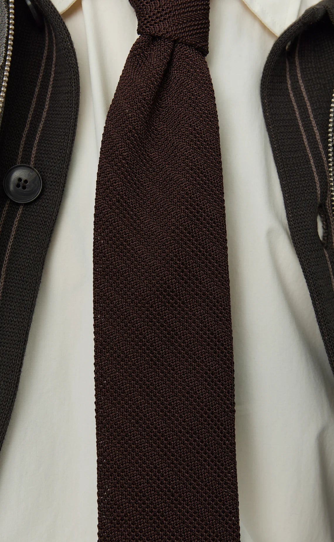 - The Formal Tie is knitted from silk in Italy in a rich brown tone with a subtle tonal stripe. Featuring a textured knit structure with a classic pointed tip