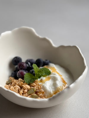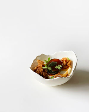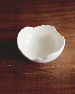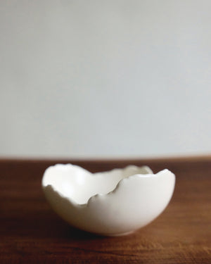 The eggshell is something even more delicate than high-fired porcelain—both white in color, hinting at translucency, but one decomposes while the other is eternal once composed. The organic edge of the EGGSHELL bowl is inspired by the randomness in which an eggshell breaks—never the same, irregularly and undulating.