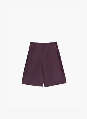- Purple basket shorts made of raw silk taffeta featuring belt loops and a jewel ring on the side