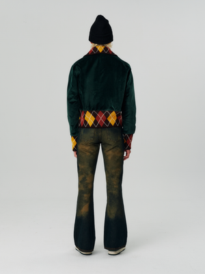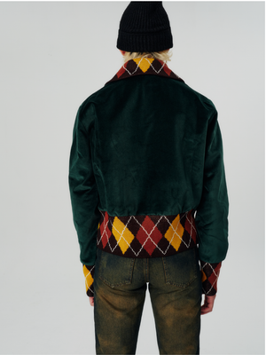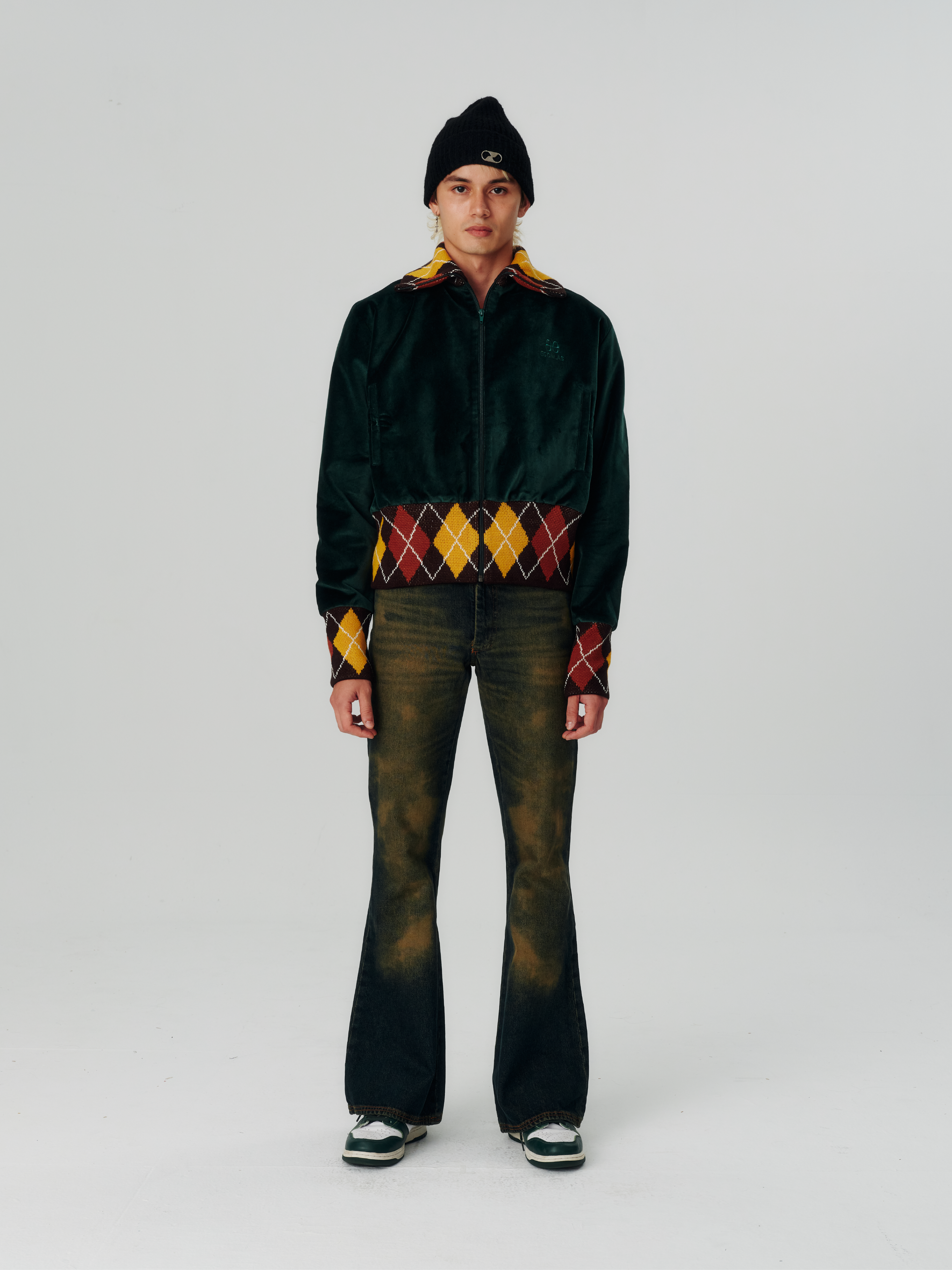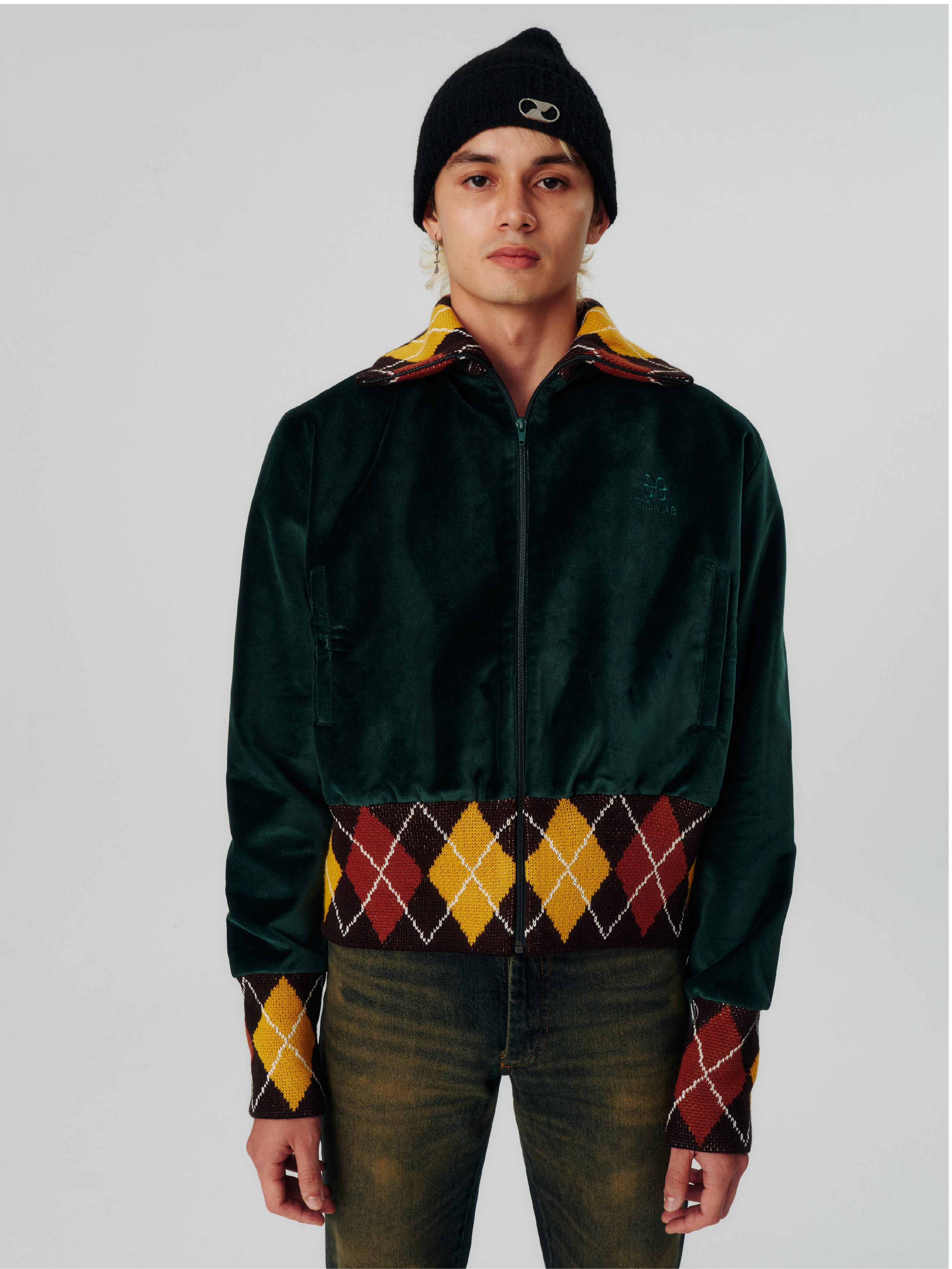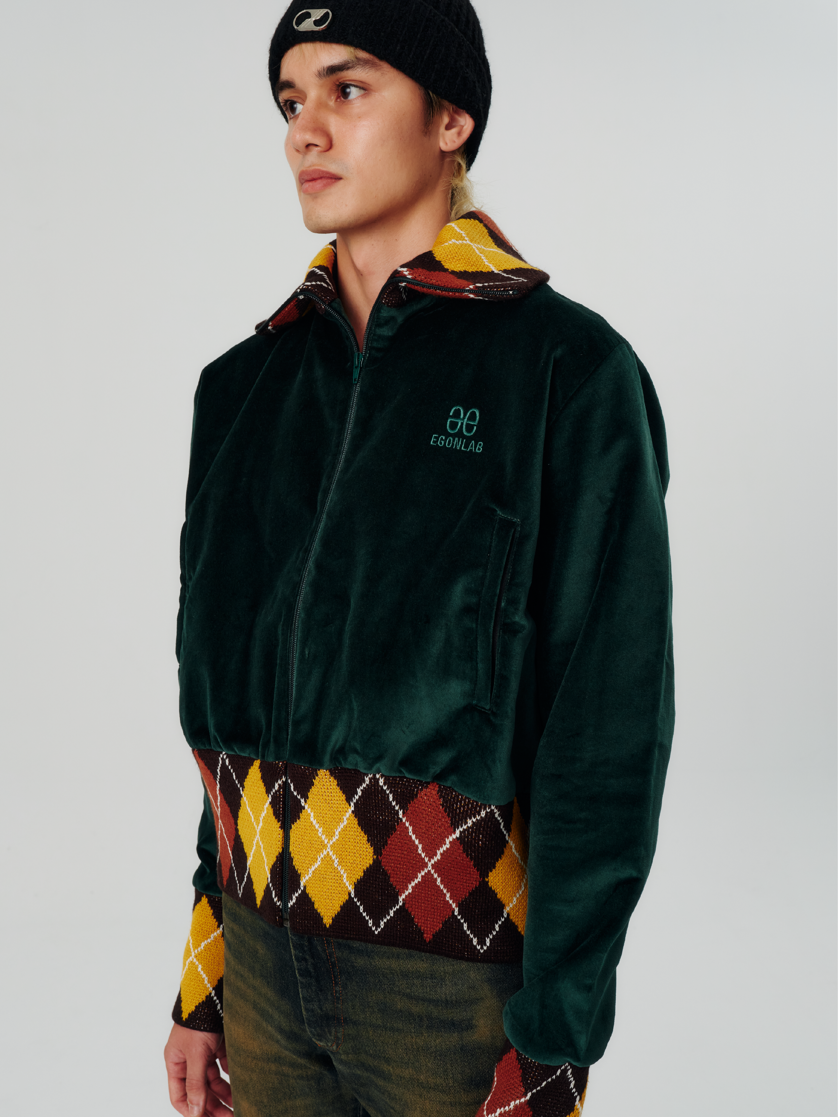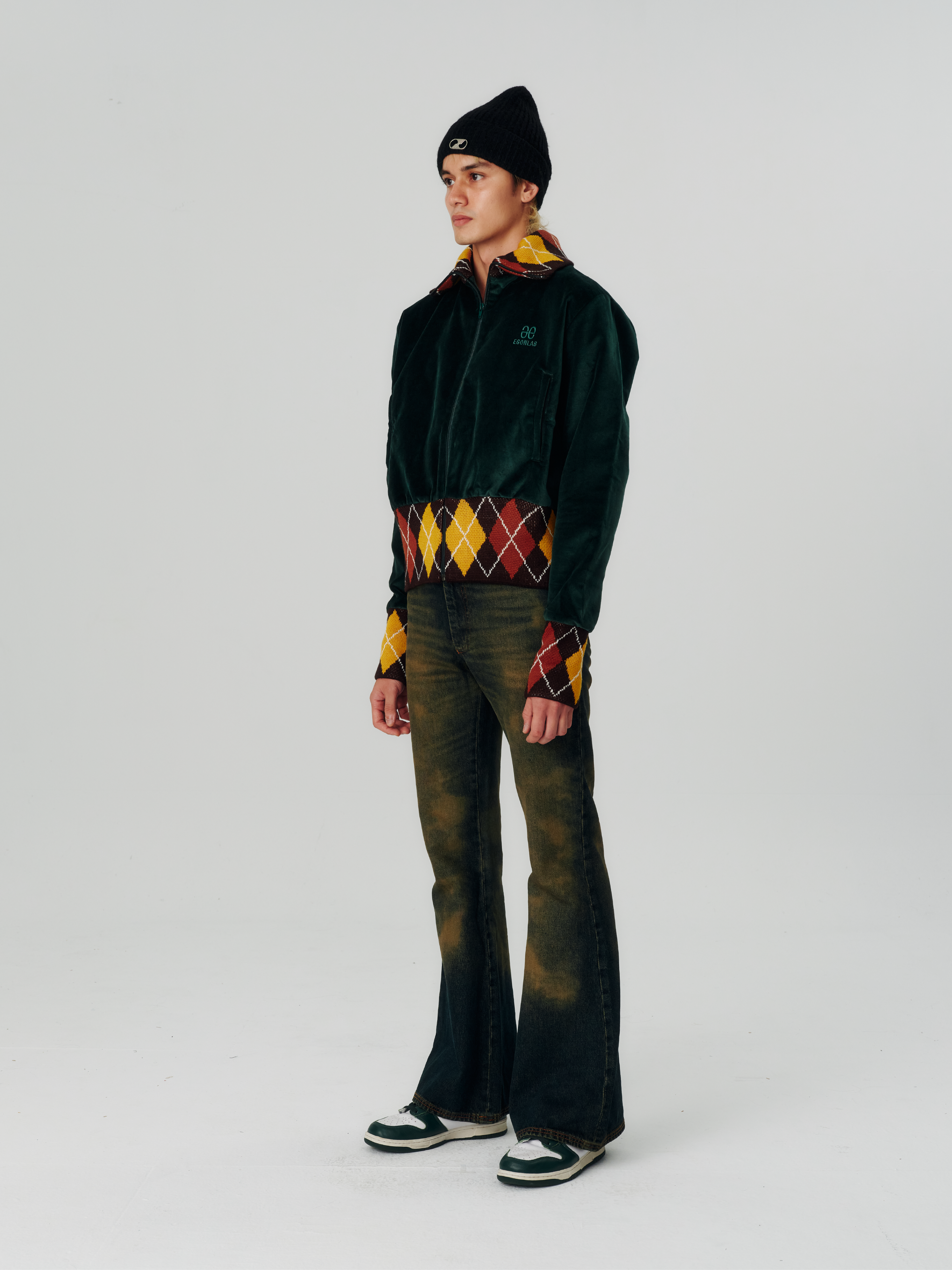 This velvet tracksuit features a diamond-weave knit hem and sophisticated green and yellow tones, providing a retro vibe and stylish style.