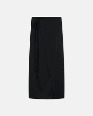 Made from glossy black slip satin, it's had a cross-over front that’s secured with ties at the side.