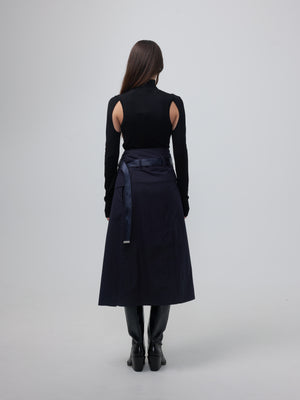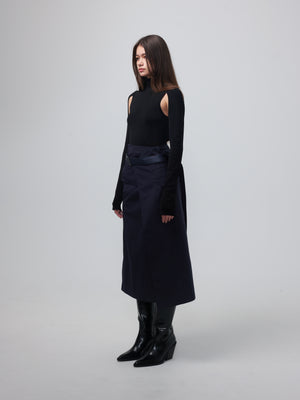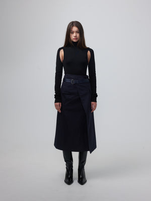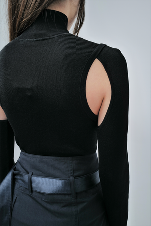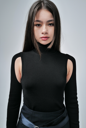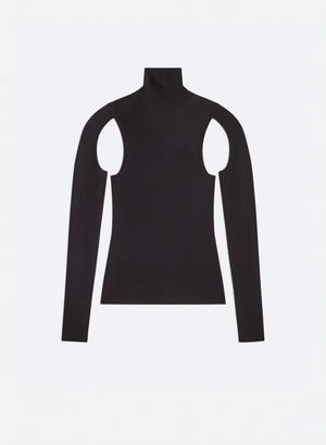 - Slim fit with underarms cutouts finished with clean self knit trims.