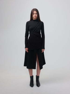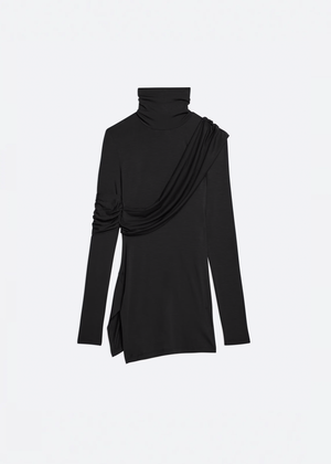 • Features a layered design with draped panels that wrap around the body, creating a sense of movement and allowing for flashes of exposed skin
