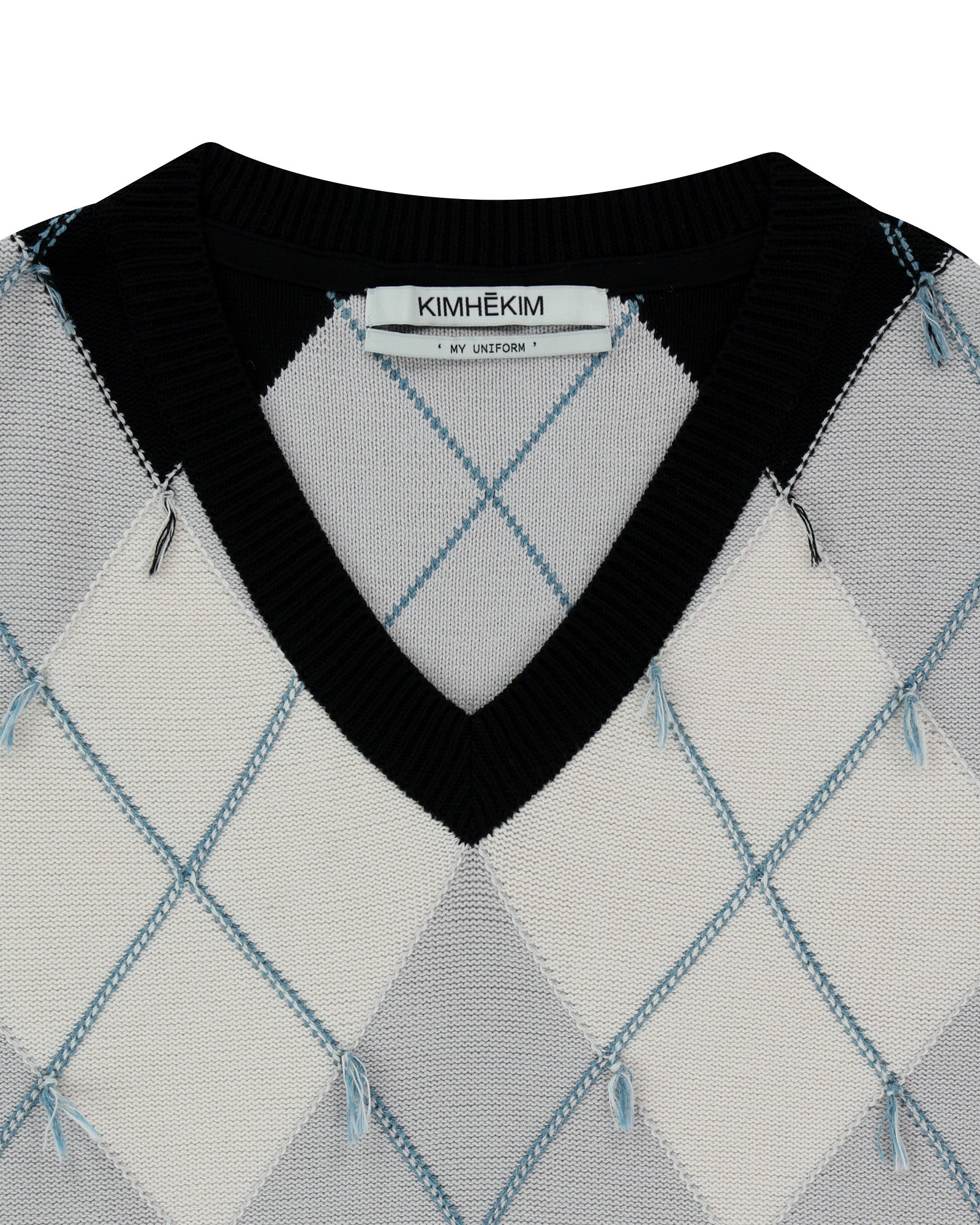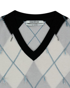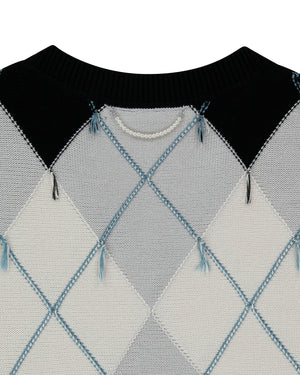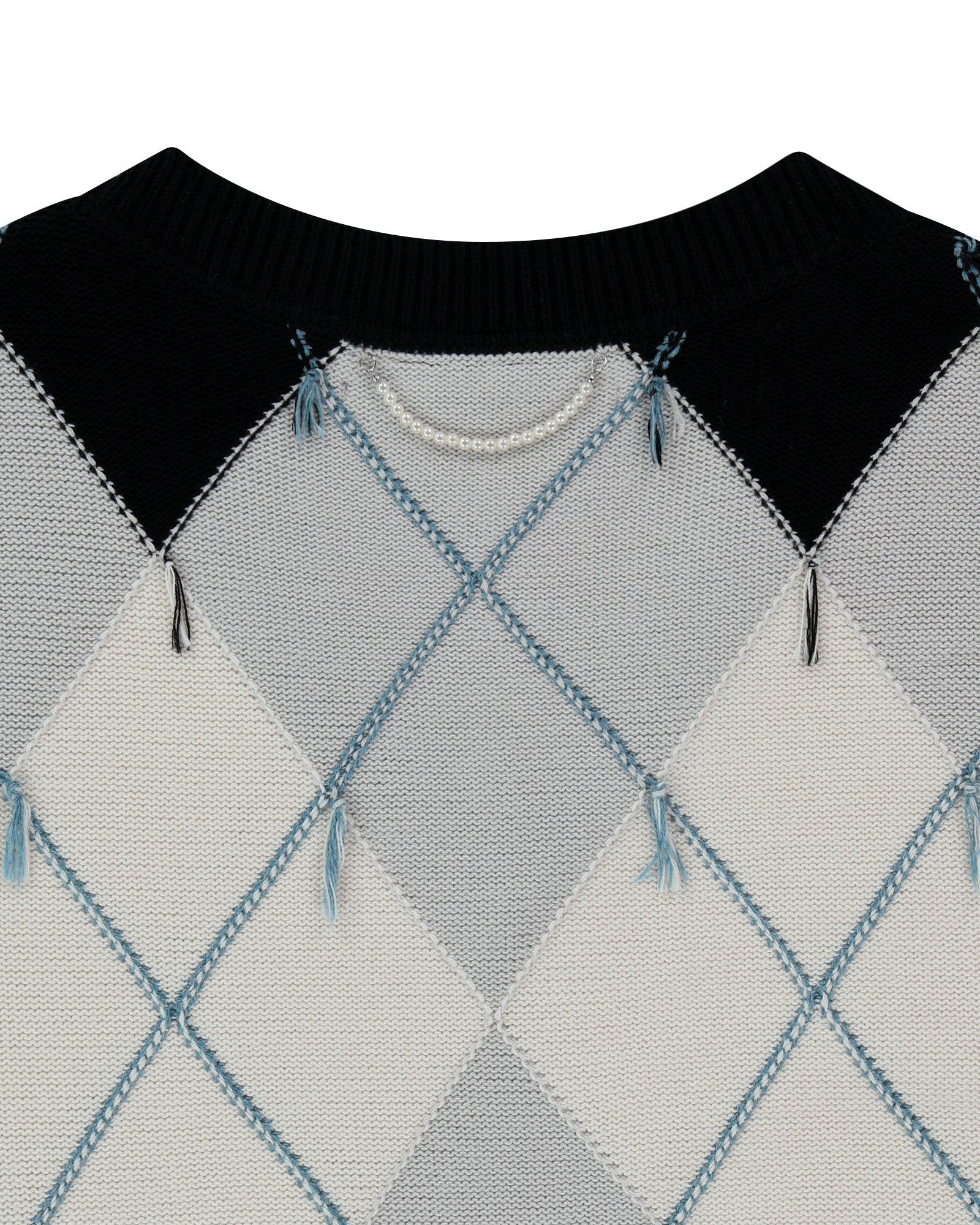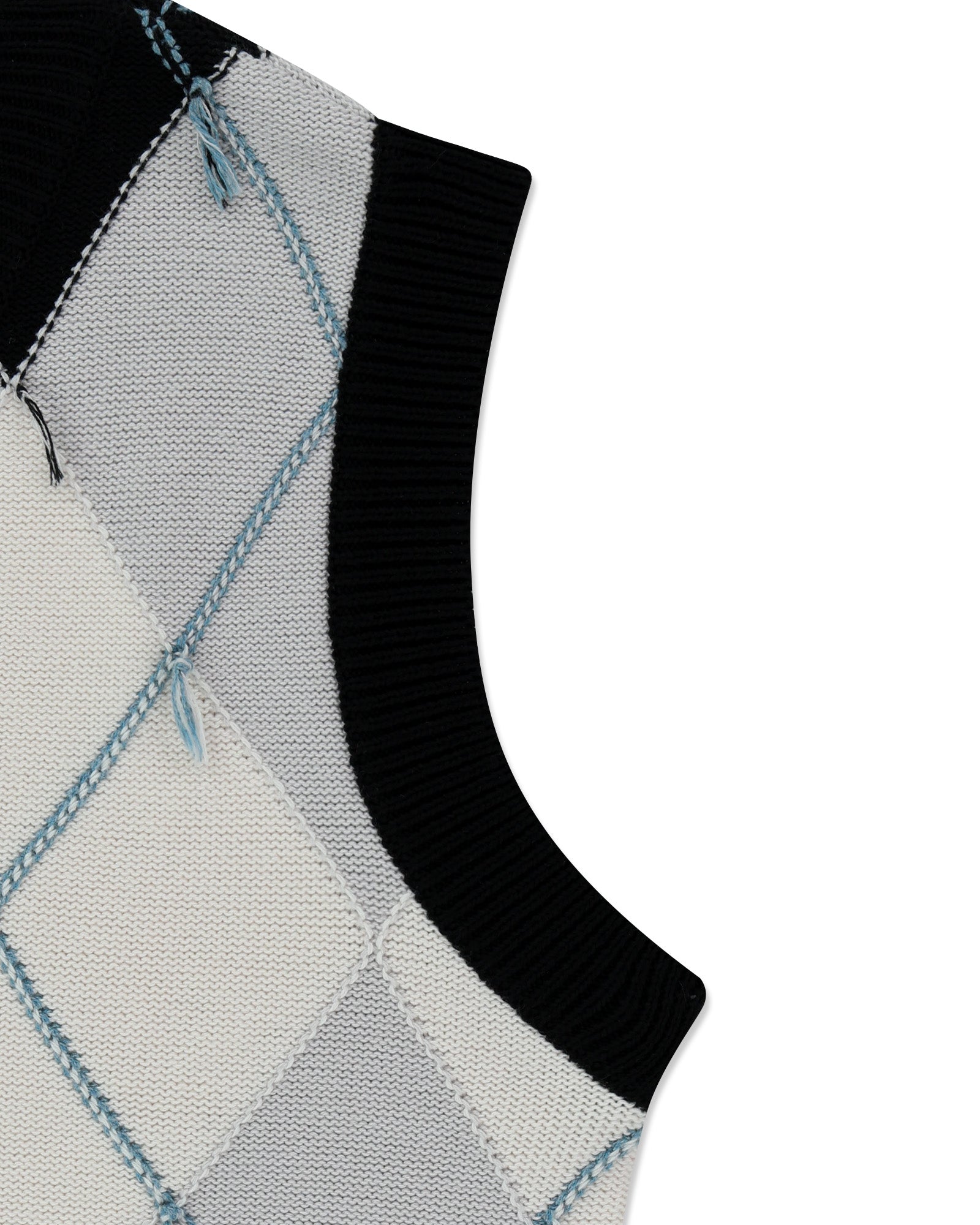 - A sleeveless reverse V-neck vest with an argyle pattern