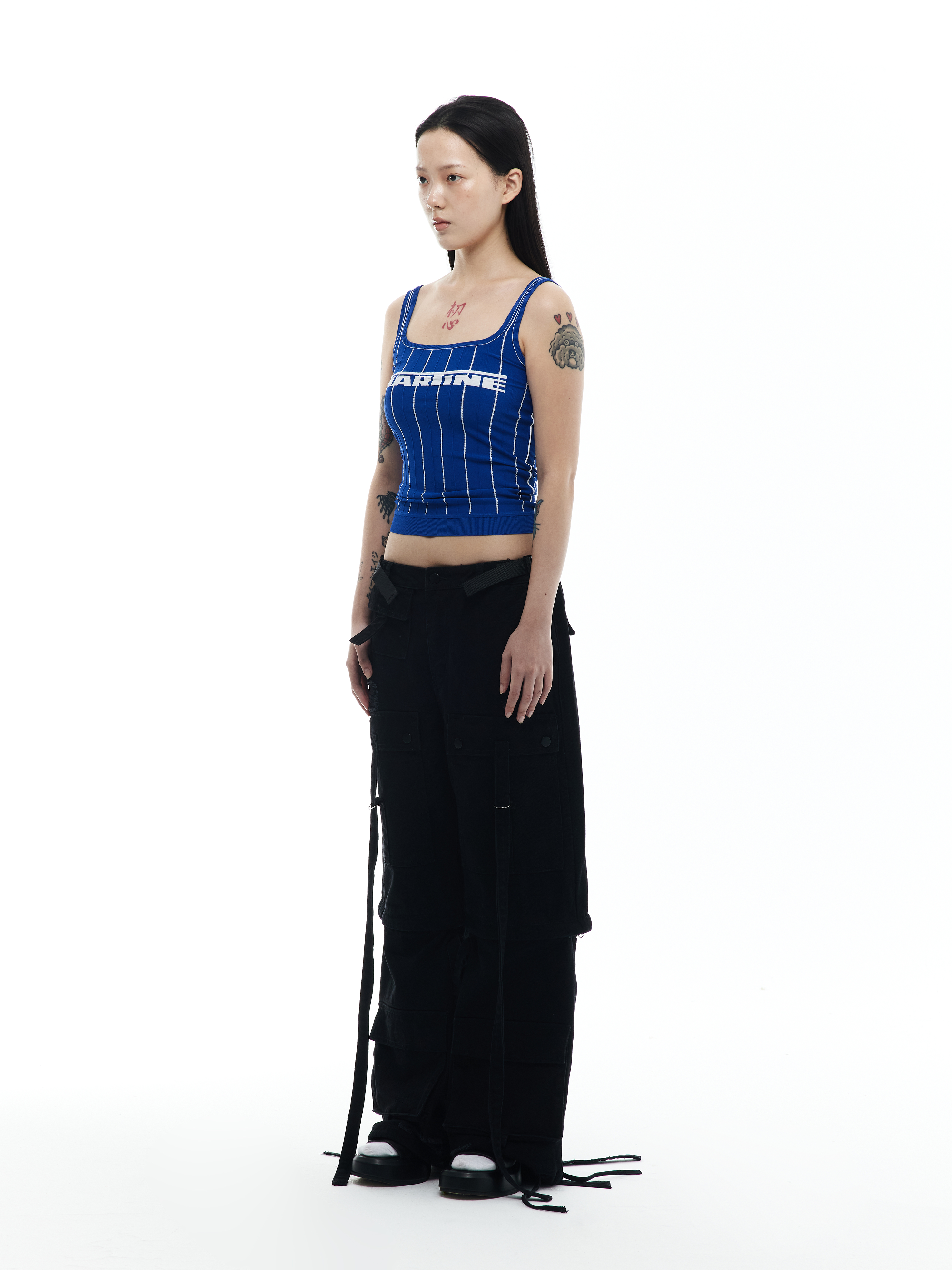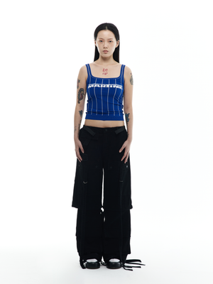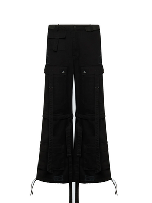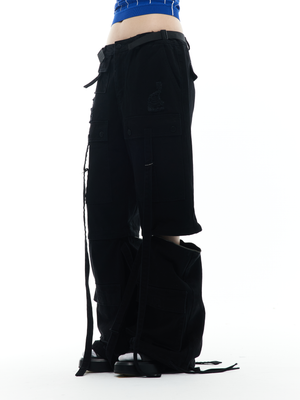 • Rigidly structured cargo pants with long laces and adjustable zippers in the knee.