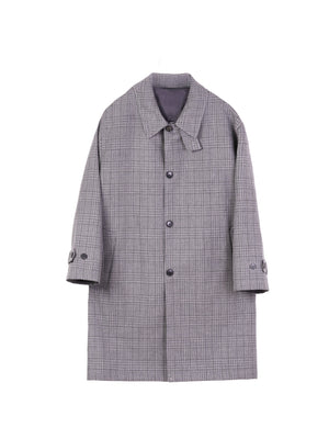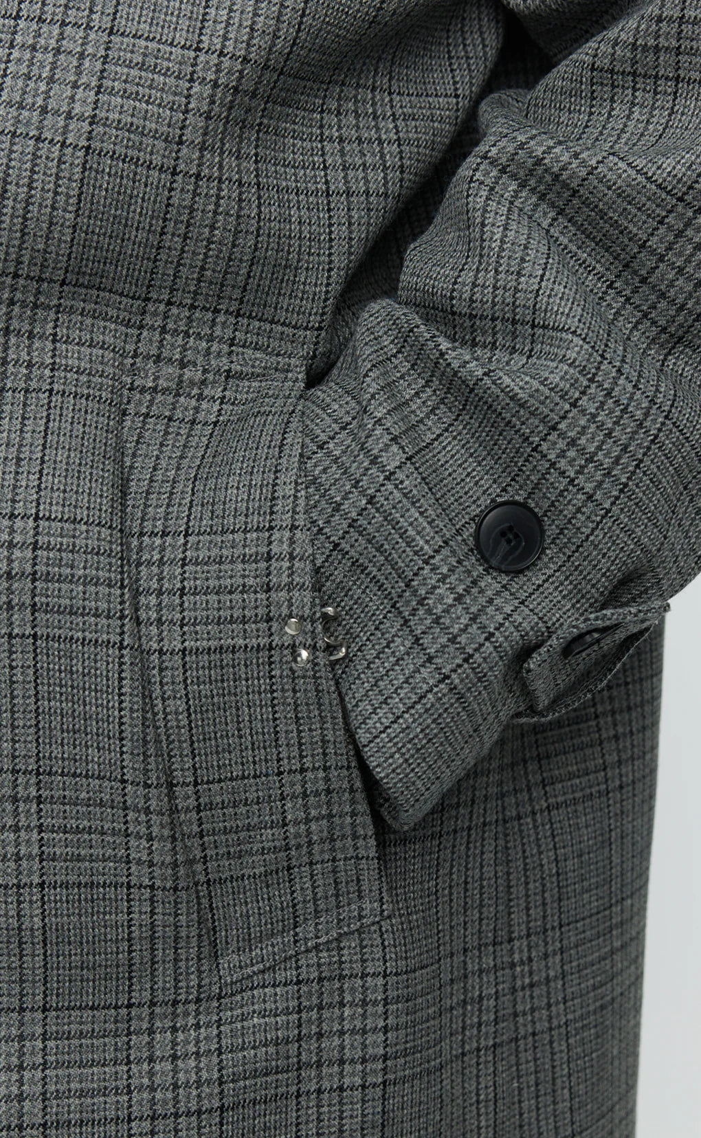 Featuring button closure, removable storm collar tab, side pockets with hook-and-eye clasp, and rear vent. Cut from dry Italian deadstock wool in a tonal grey glen check