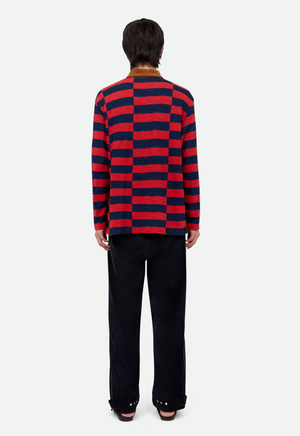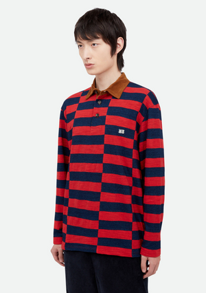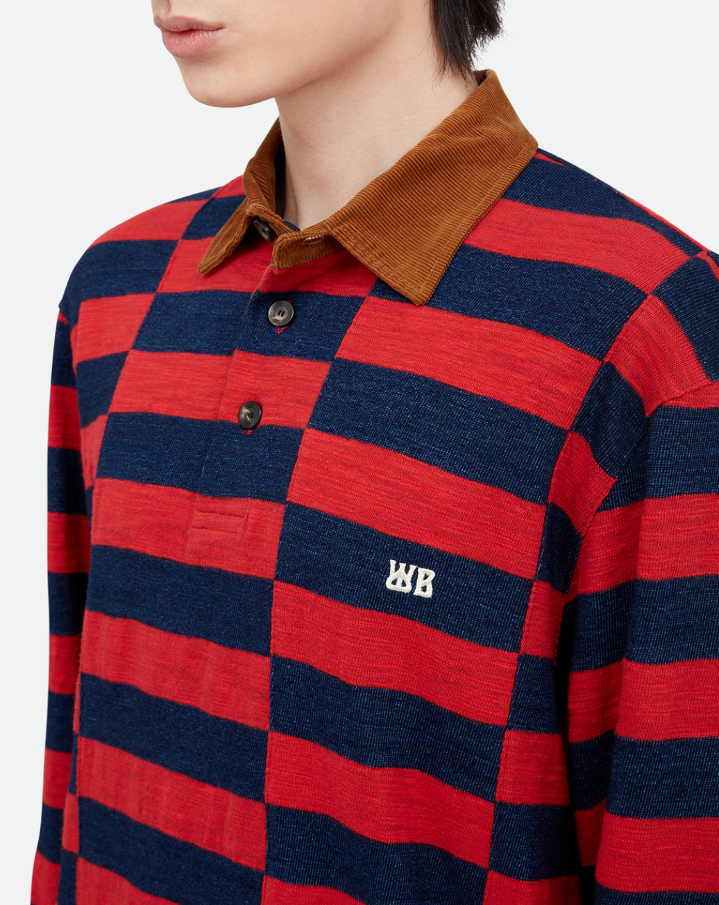 • Japanese canvas is rendered in a rhythmic color-block stripe pattern with a contrast corduroy polo collar