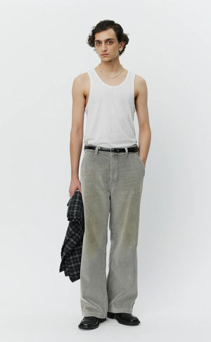 - The Cord Trousers has a relaxed straight fit with a mid-rise. Featuring side pockets, rear patch pockets, flower rivets, metal button closure and YKK zip fly. Cut from soft garment washed grey corduroy in a recycled cotton blend with laser stain effect