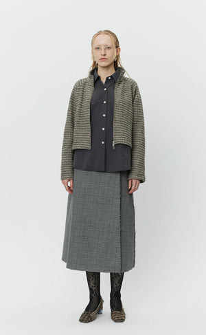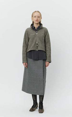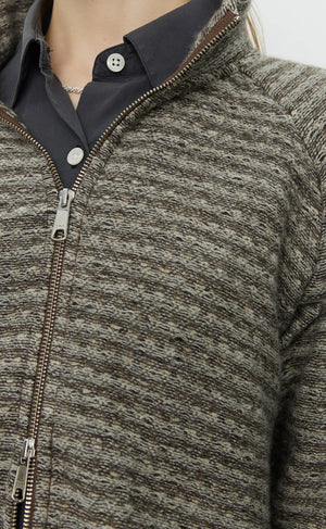 - The Cropped Leisure Zip Up has a relaxed, boxy fit with raglan sleeves. Featuring a high neck and two-way zip. Cut from a soft brushed wool with a brown "broken" stripe on an off-white ground
