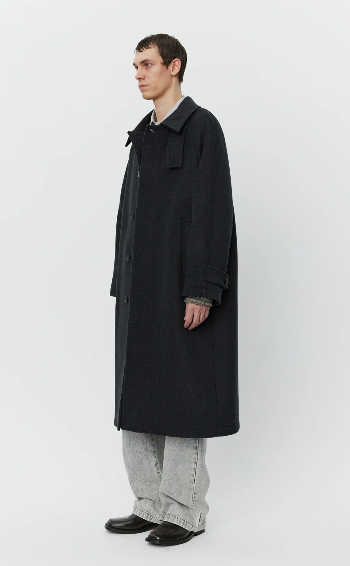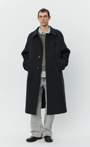 - The Installation Coat is calf length with an oversized fit and raglan sleeves