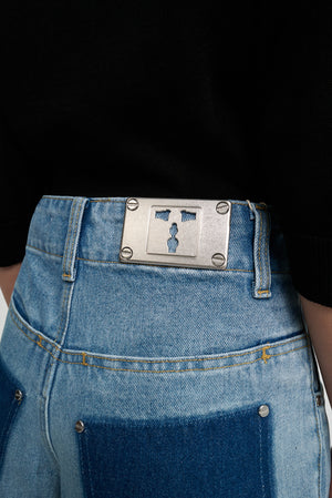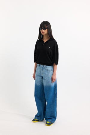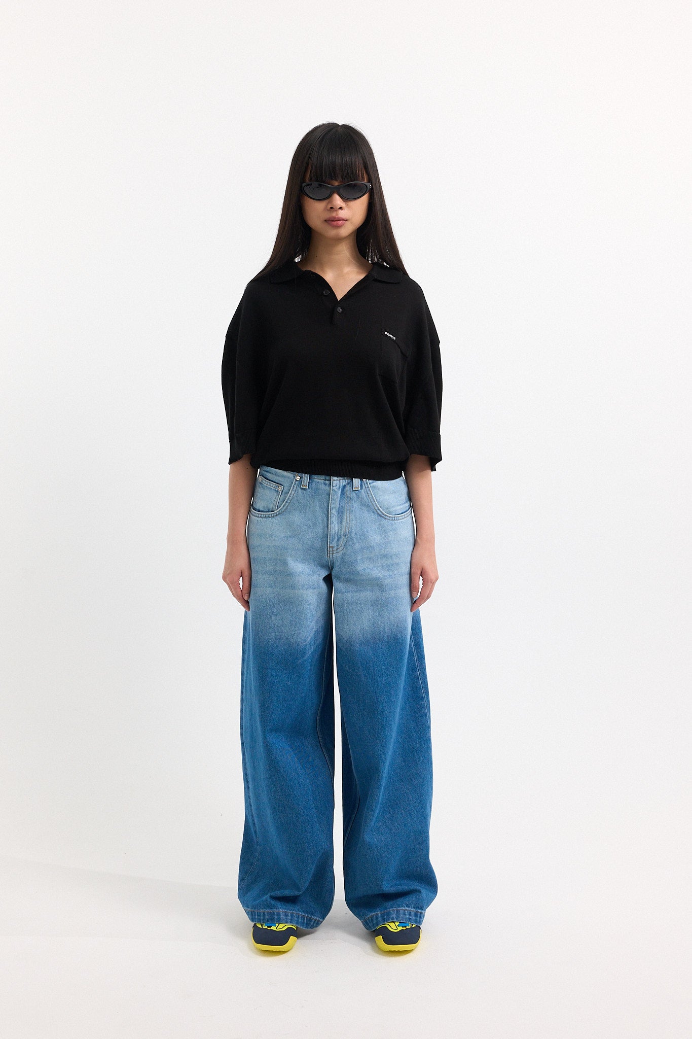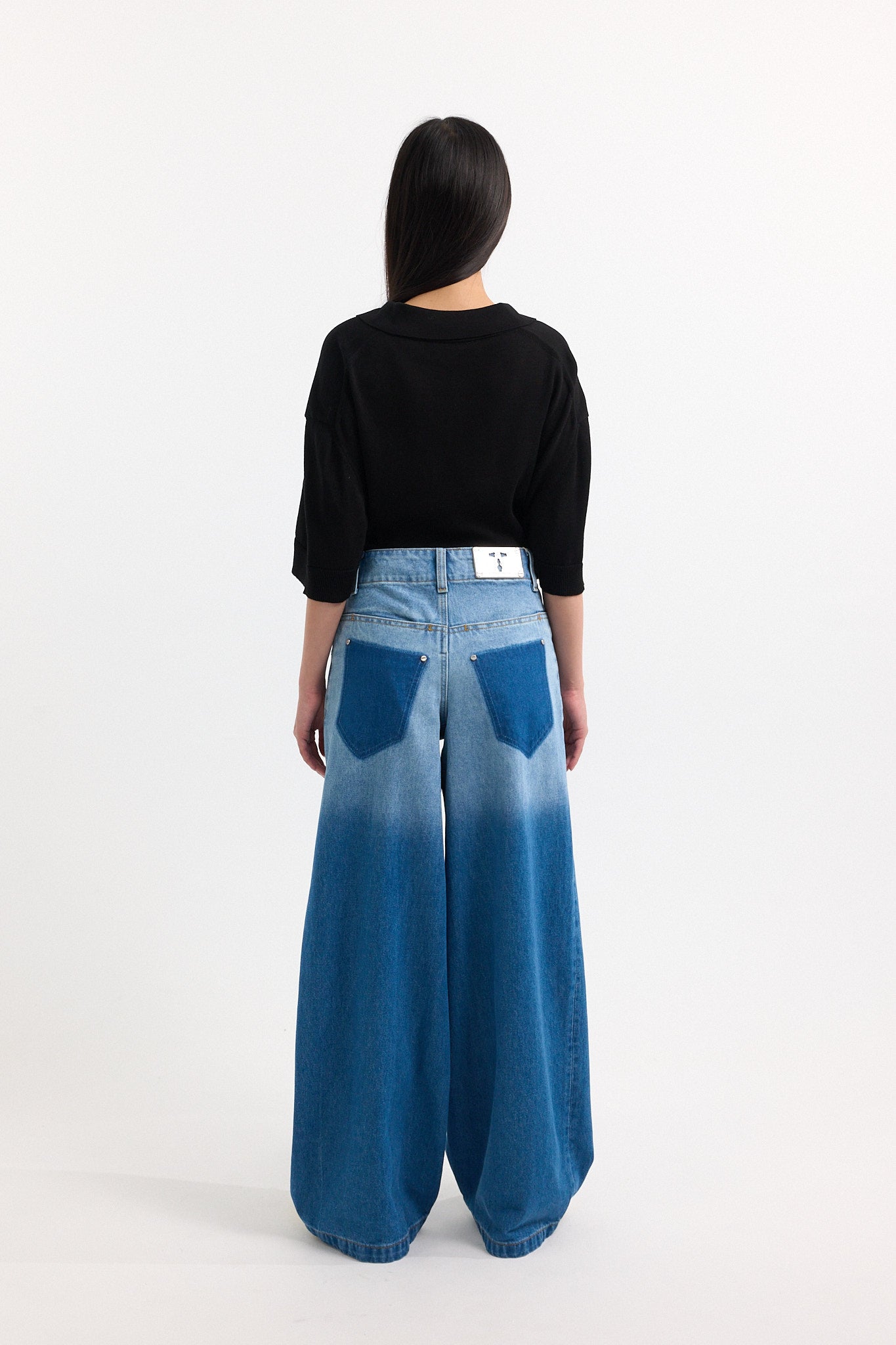 - Unisex jean designed to sit at the hip with a wide relaxed leg