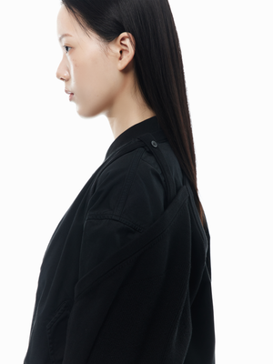 - Ribbed stand collar, hem, and cuffs