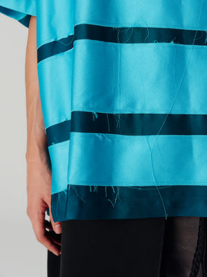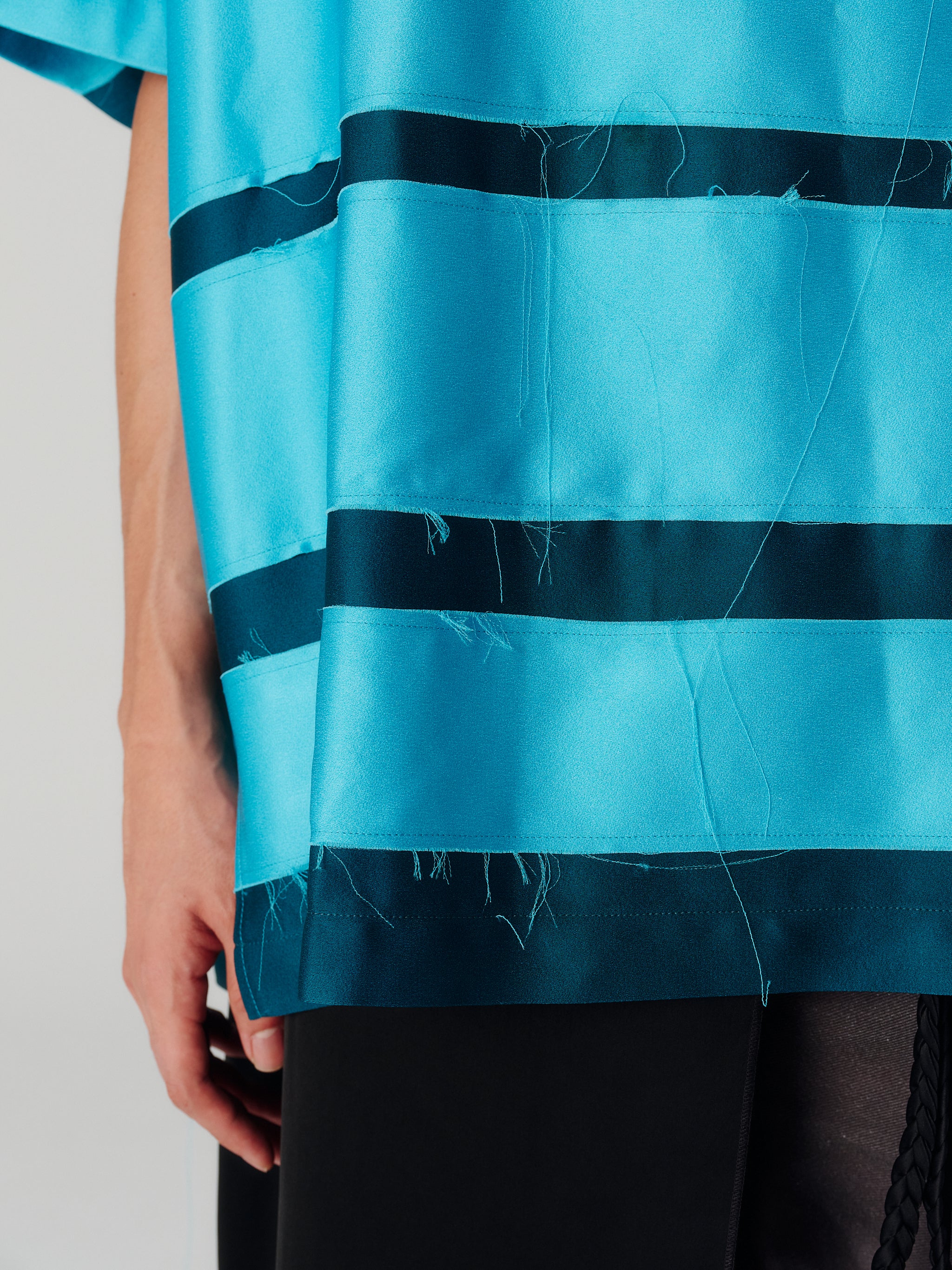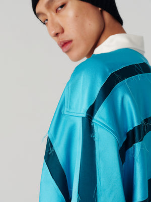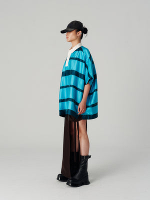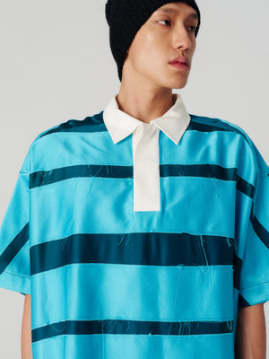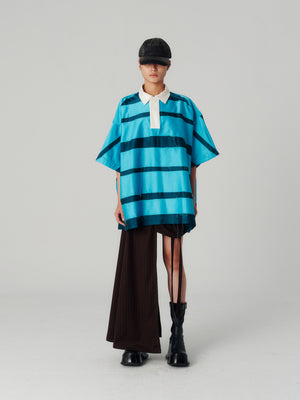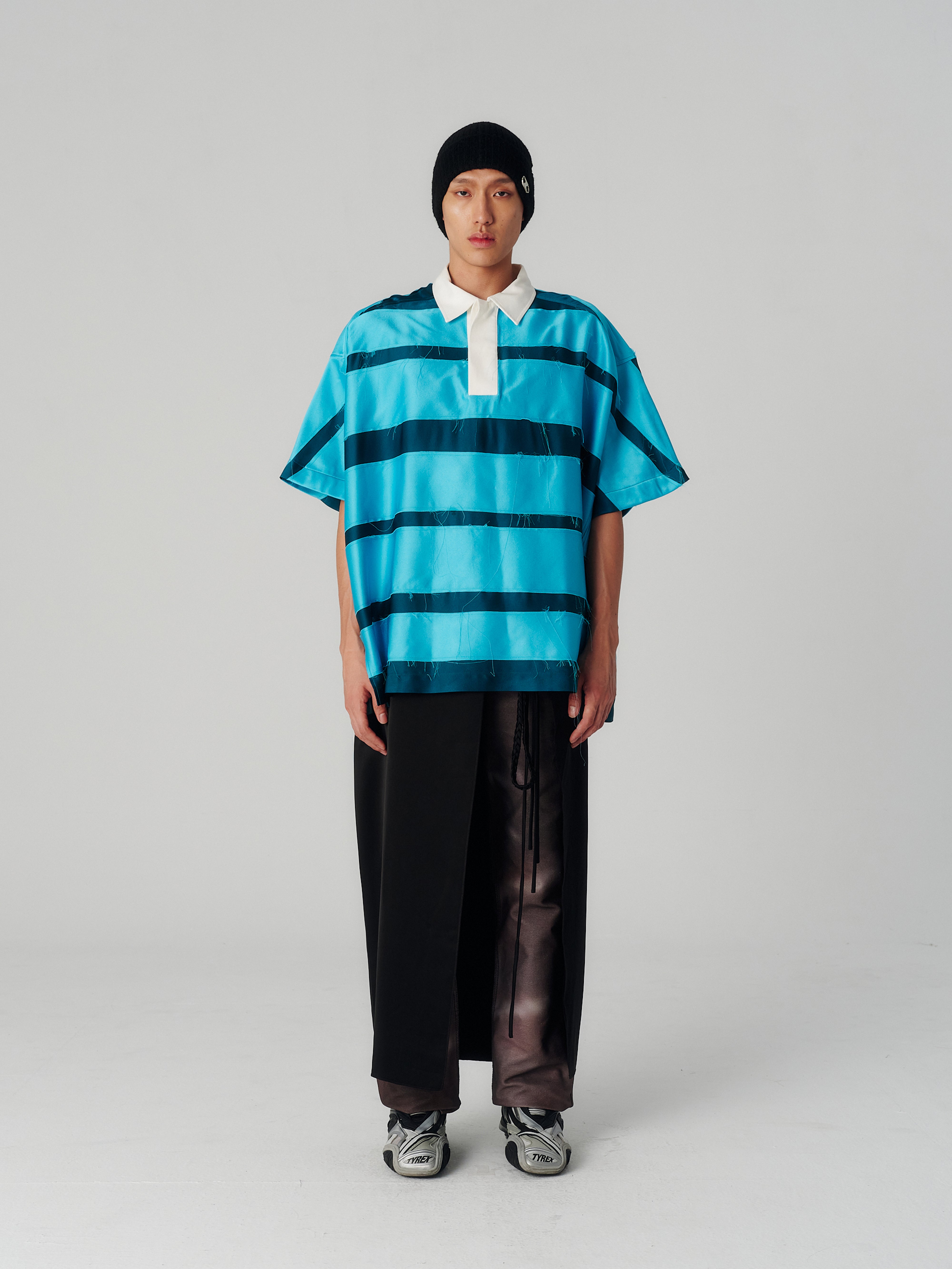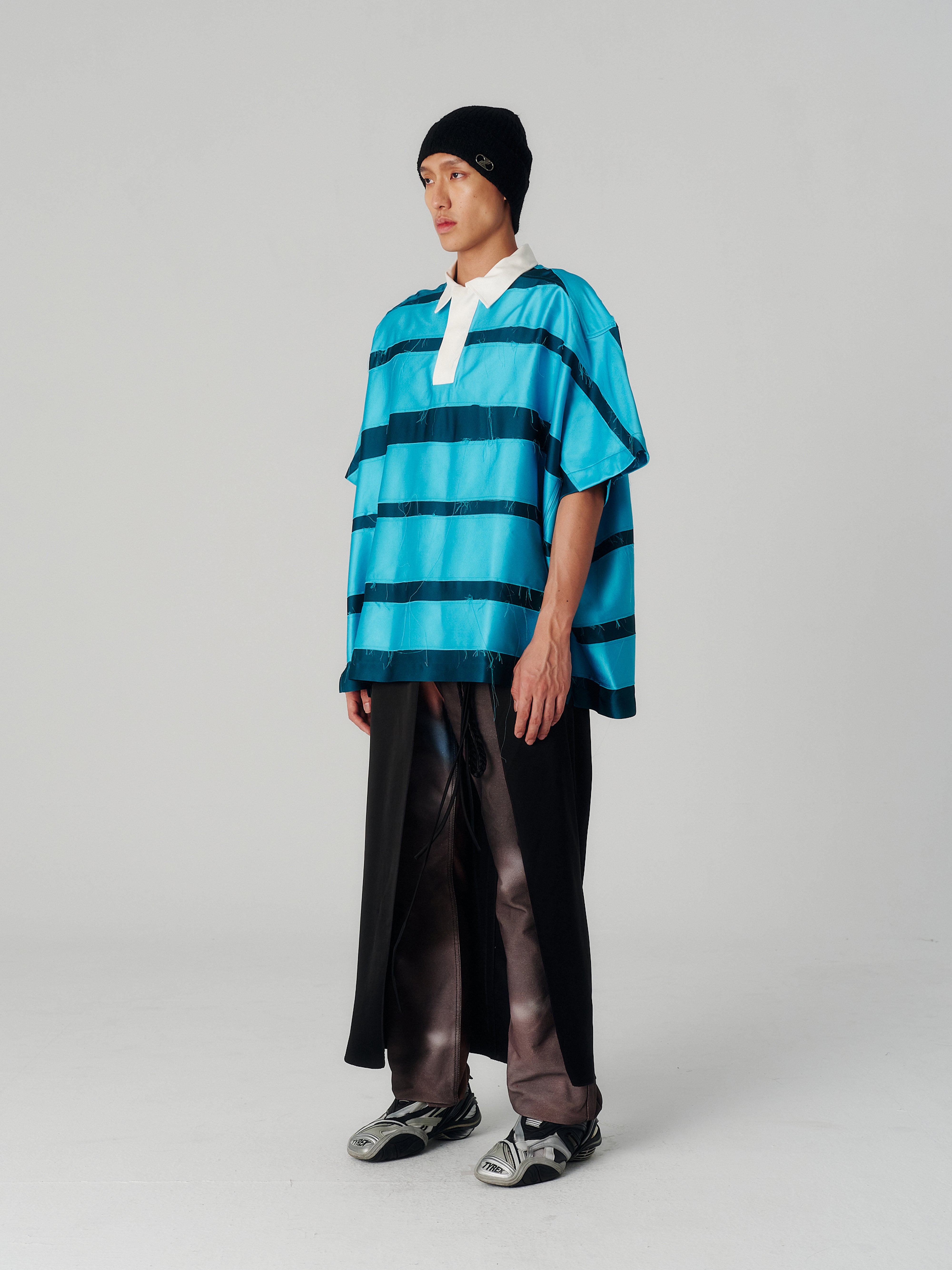 Iconic BOTTER sculptured polo with cotton twill polo collar and blind closure. Hand sewn recycled wool stripes, fringed by hand. Oversized look.