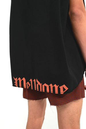 Sleeveless button up hooded shirt in black with printed gothic logo