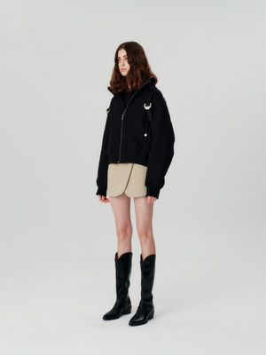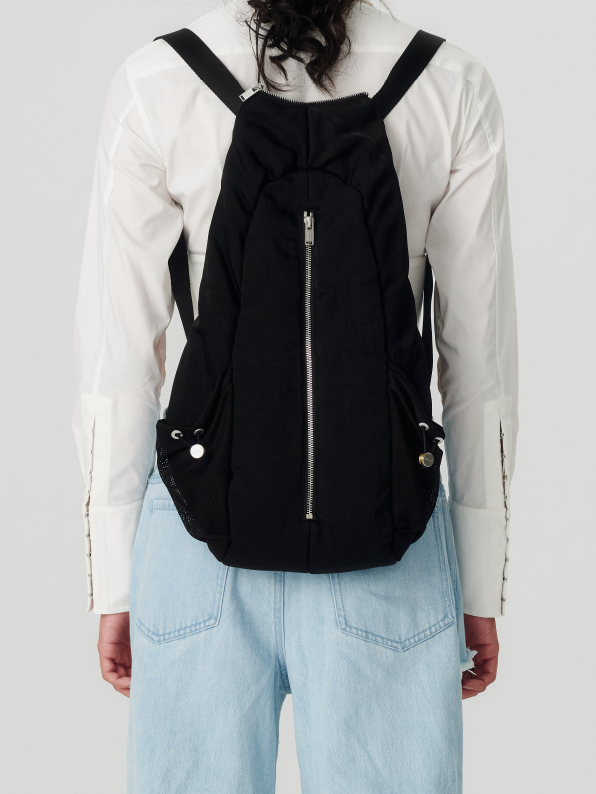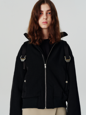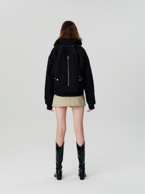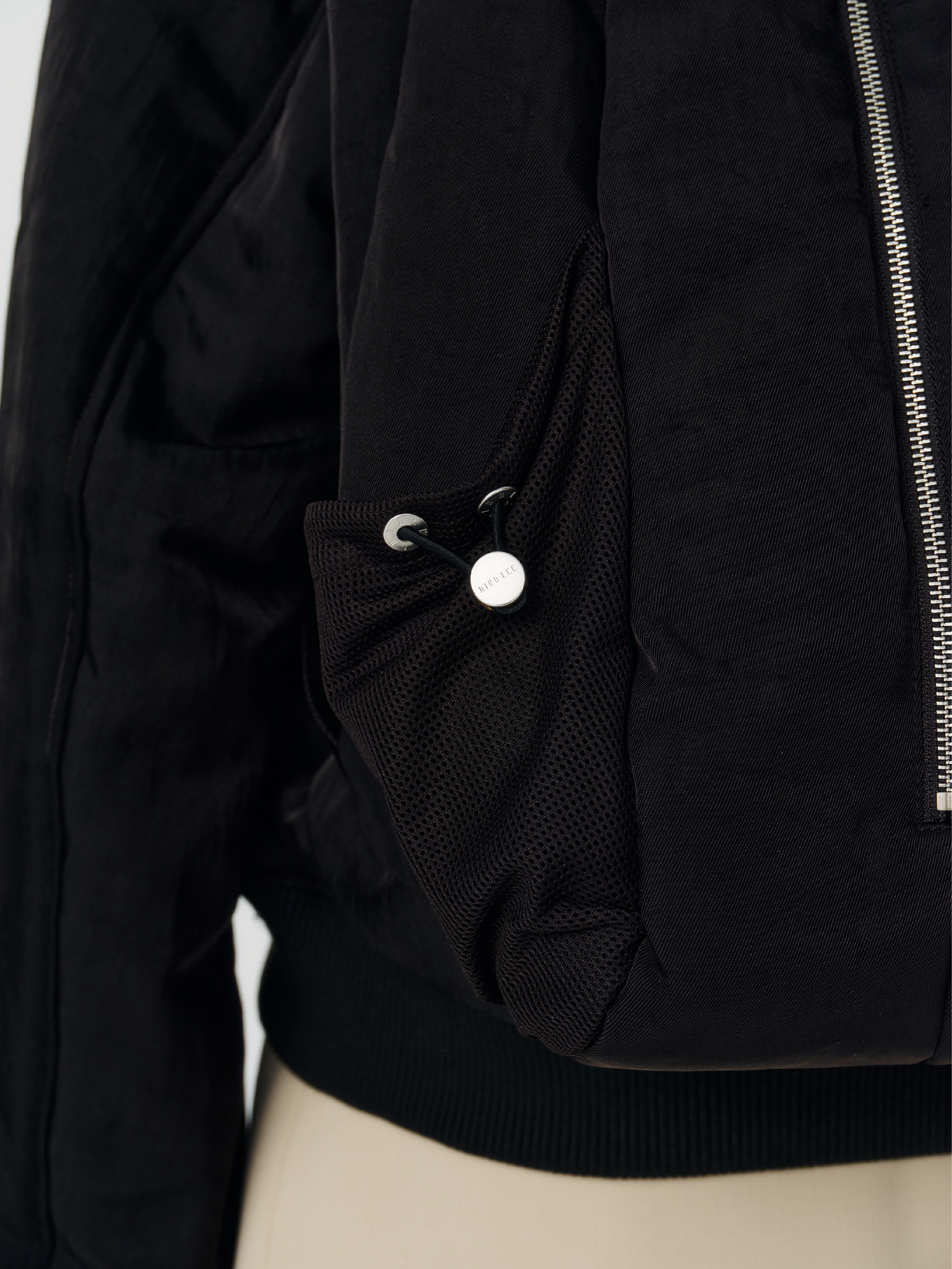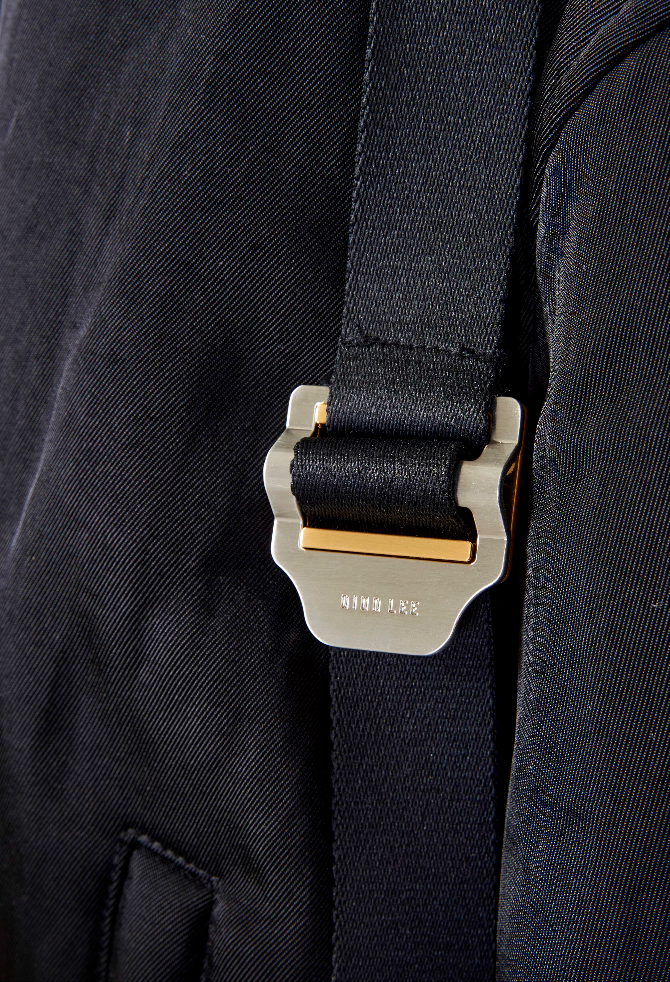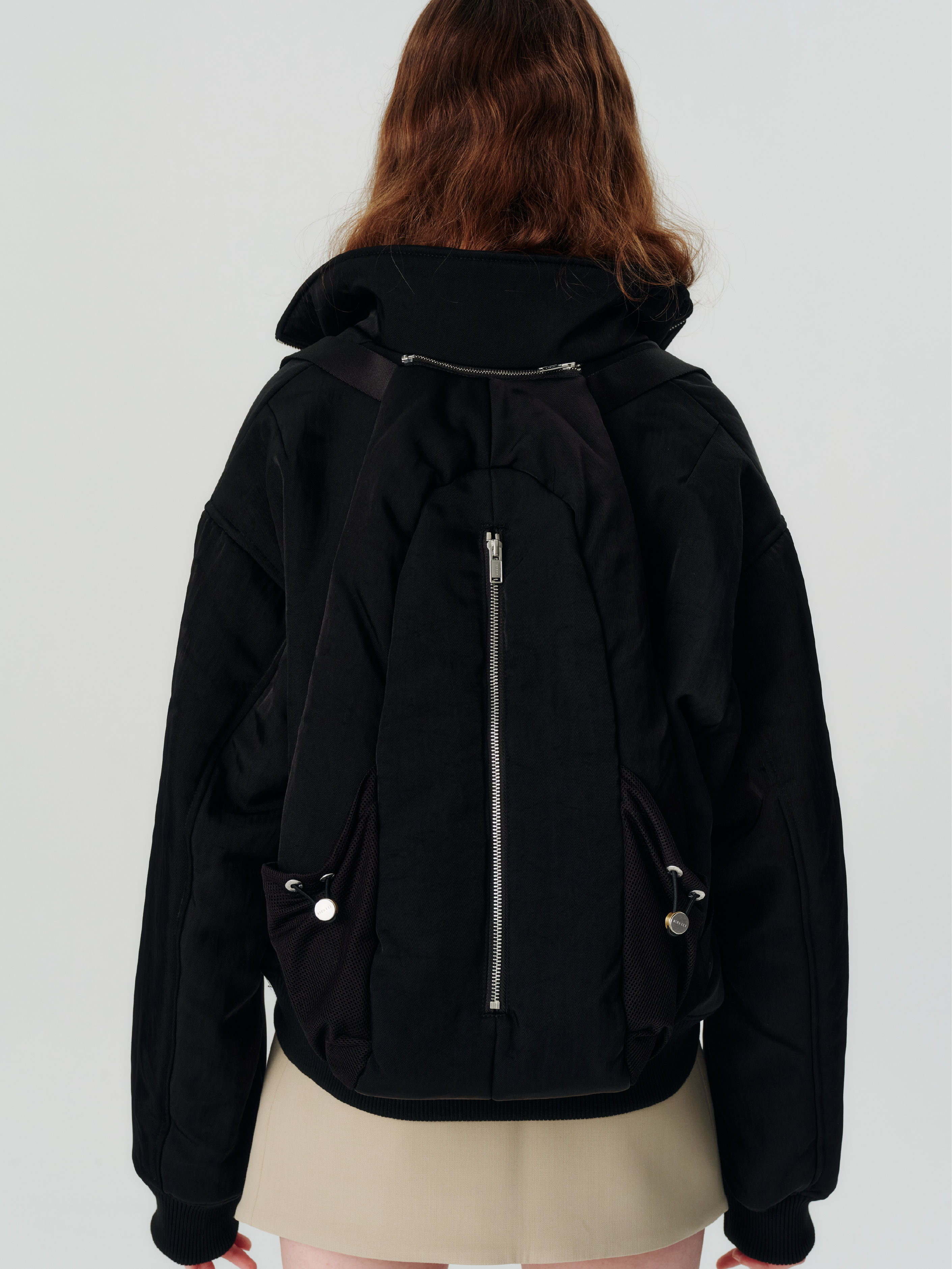 Bomber jacket fabricated in a soft matte nylon with detachable backpack. Lightly padded construction with compact ribbing at hem and cuffs. Slimline backpack features central metal zip and mesh side pockets with signature two tone toggles. Nylon webbing straps with safety slider hardware. Designed for a regular, relaxed fit with a high collar.