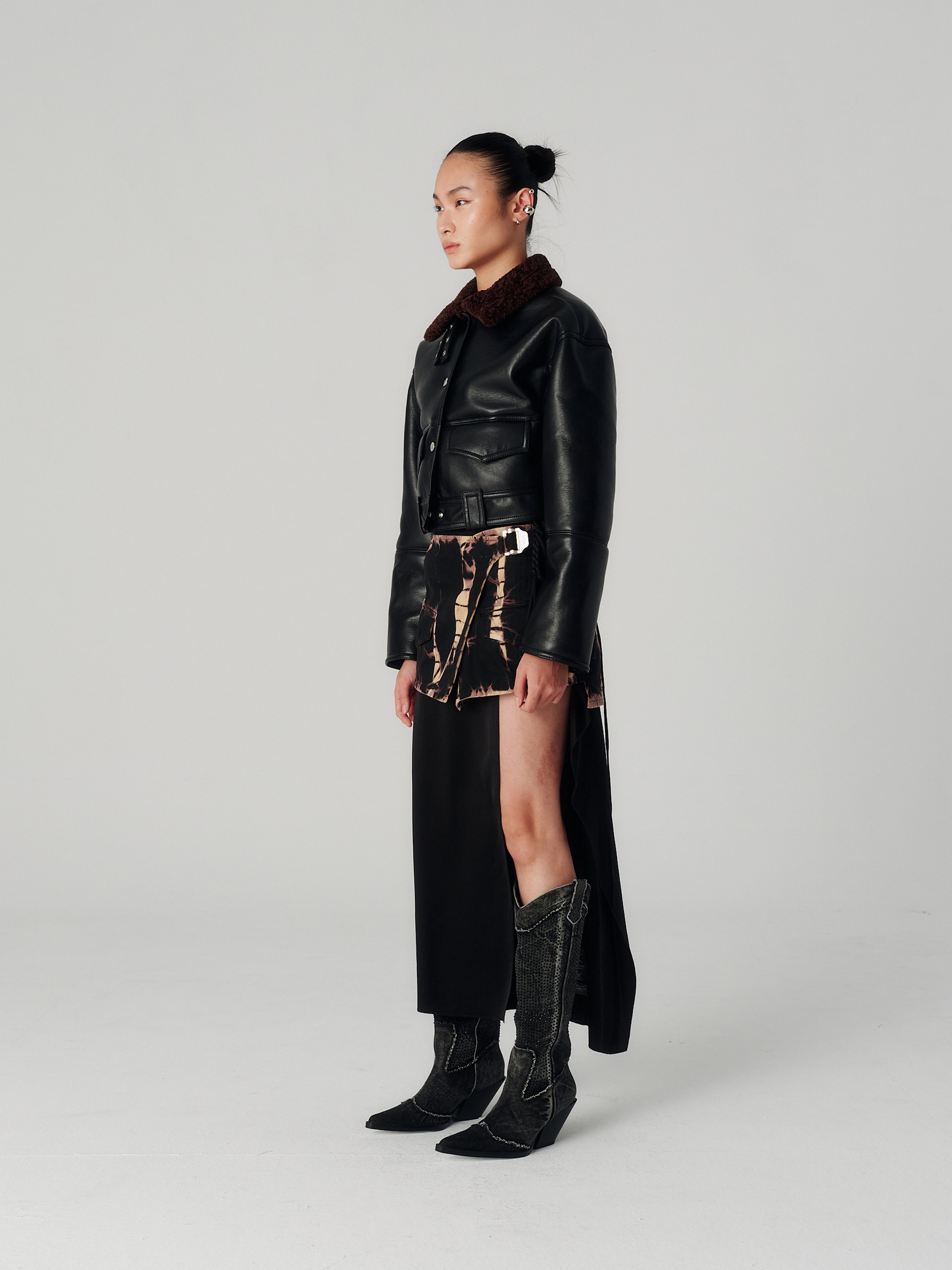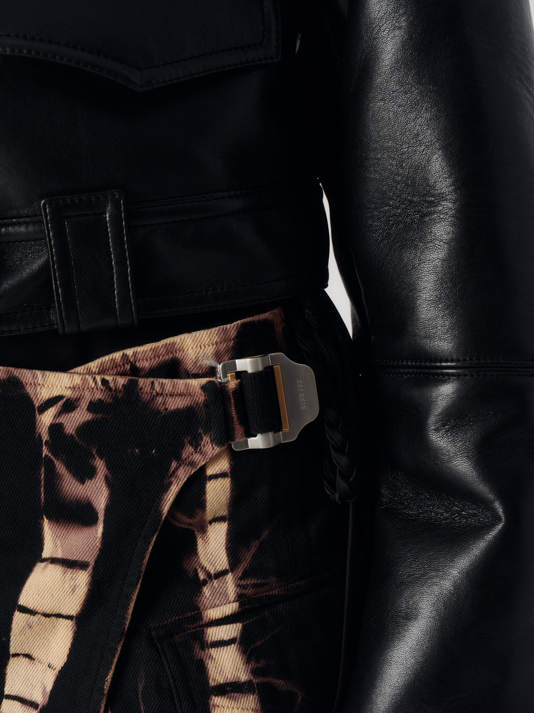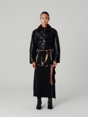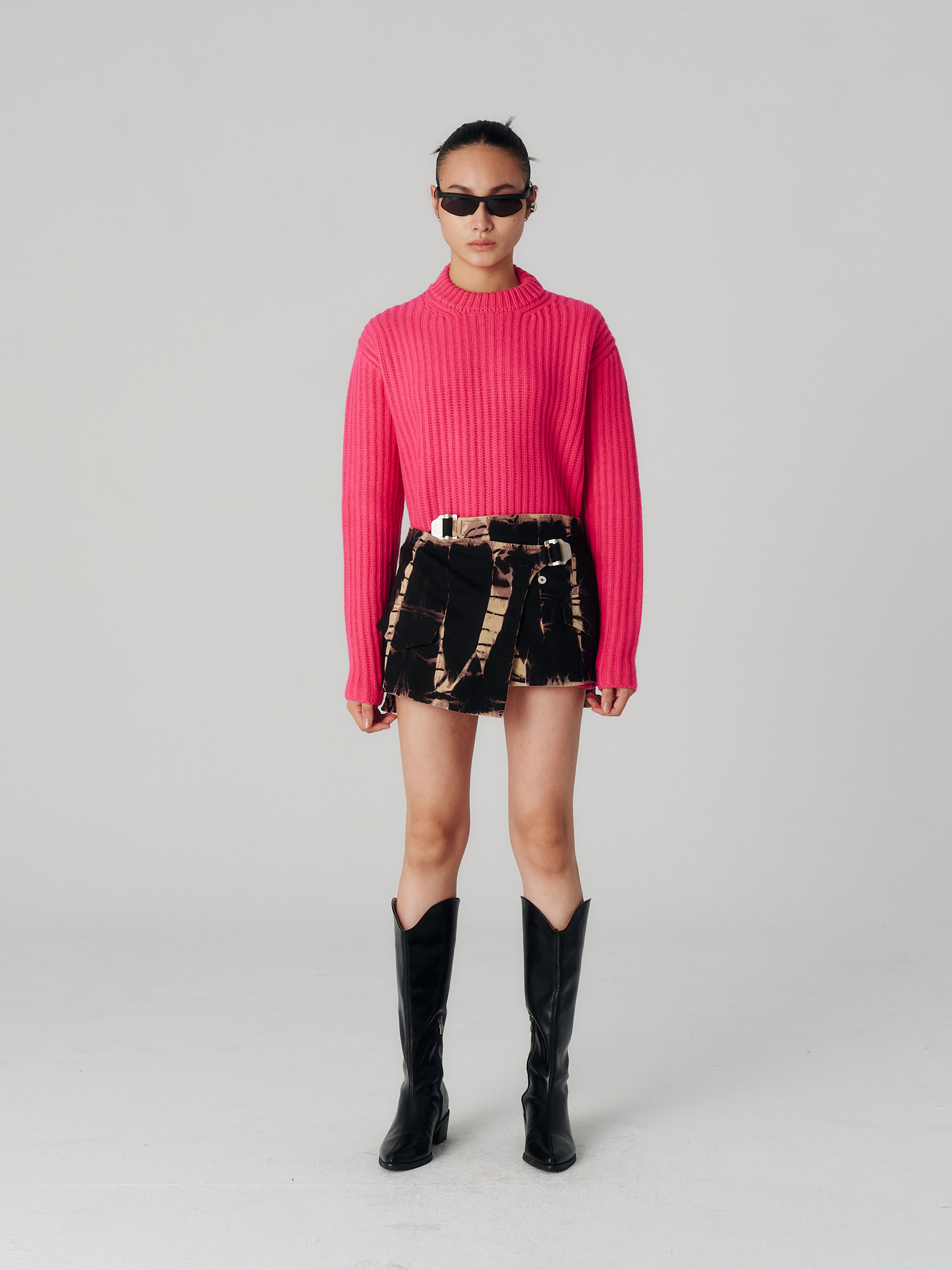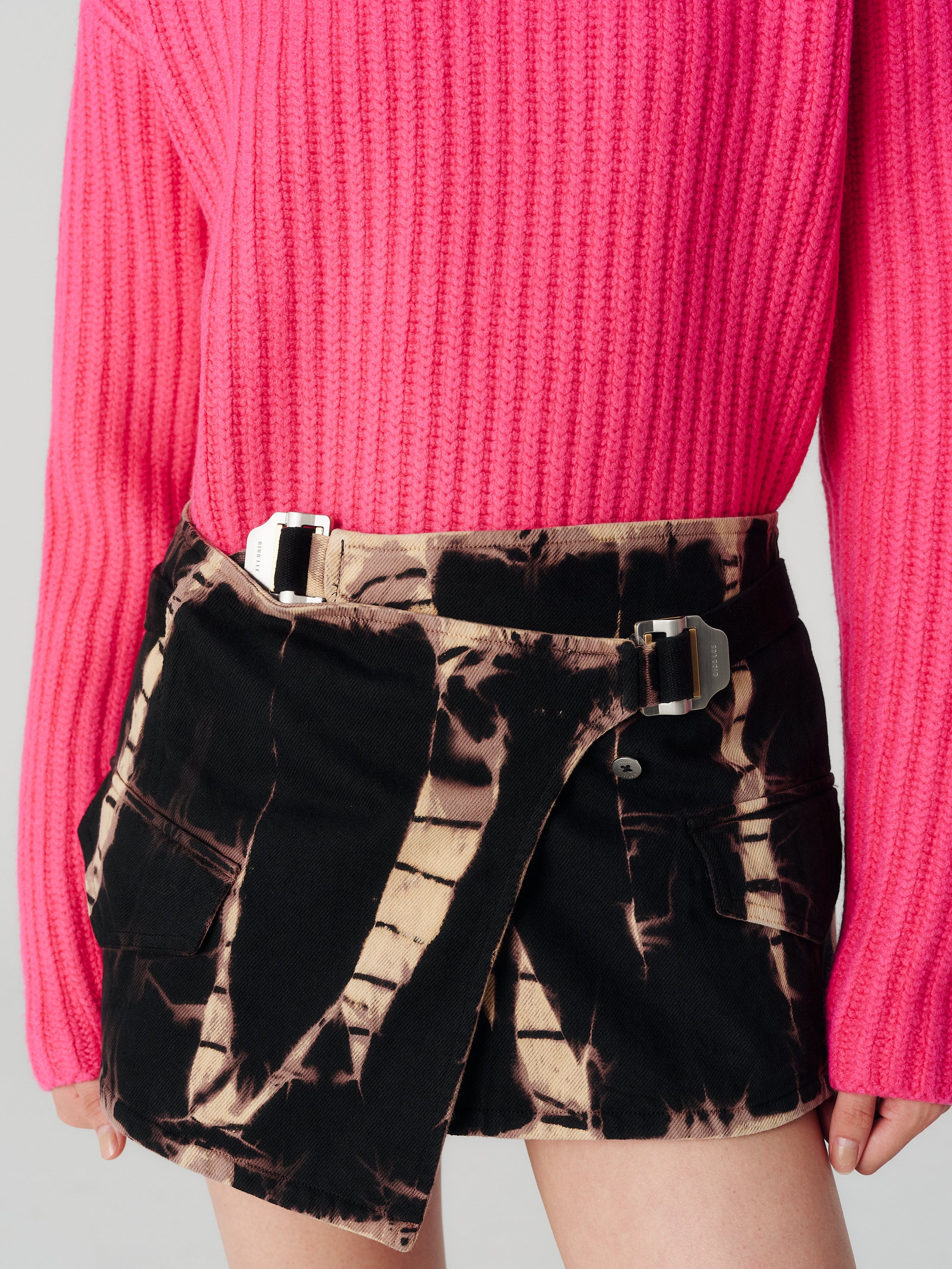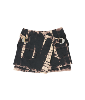 Mid-rise mini skirt cut in a soft, midweight denim. Garment is reverse tie-dyed with bleach for unique variations in each piece. Skirt wraps with cotton grosgrain tape and custom slider buckle hardware. Cut to sit at the hip with a stacked hem.