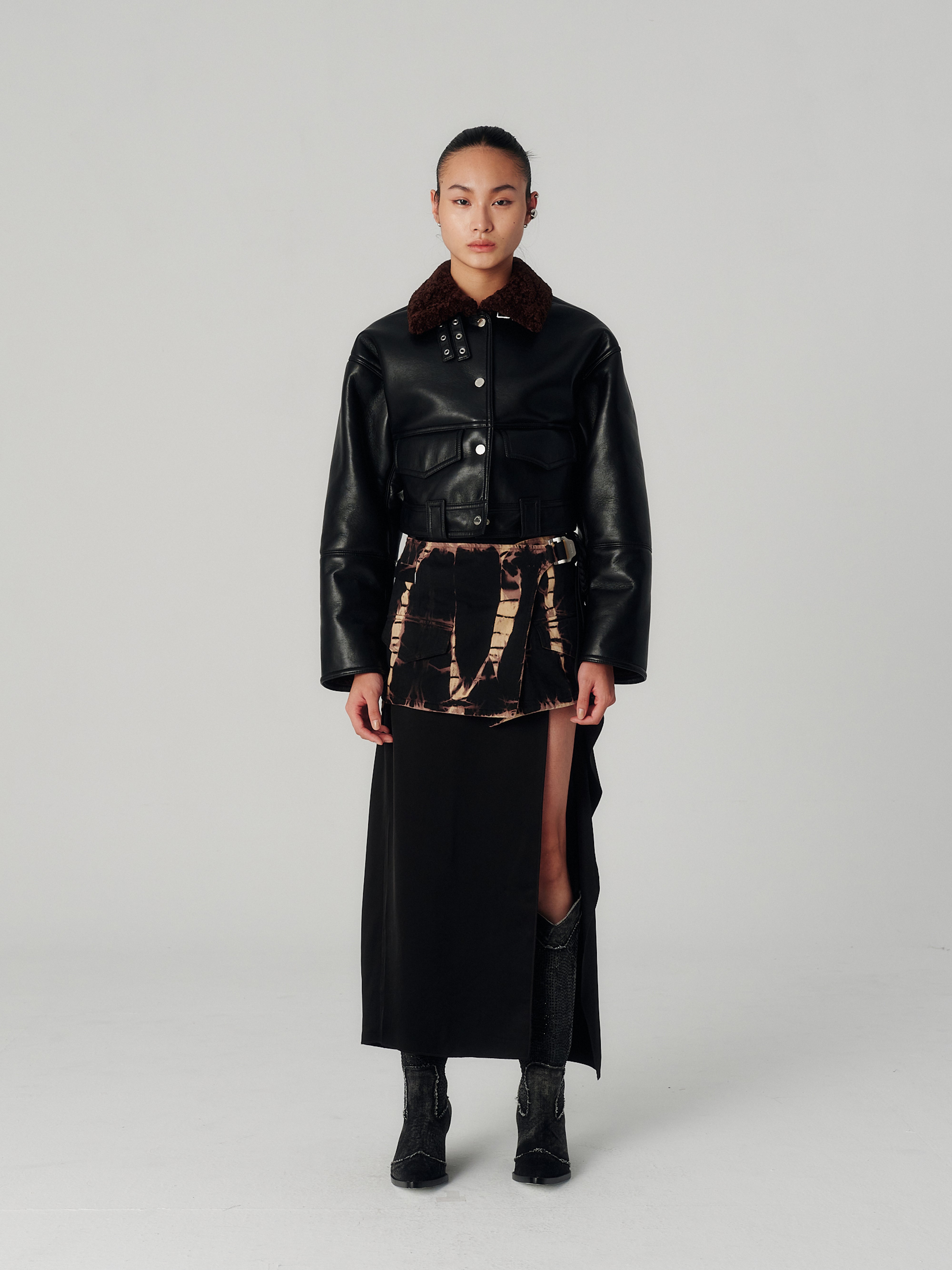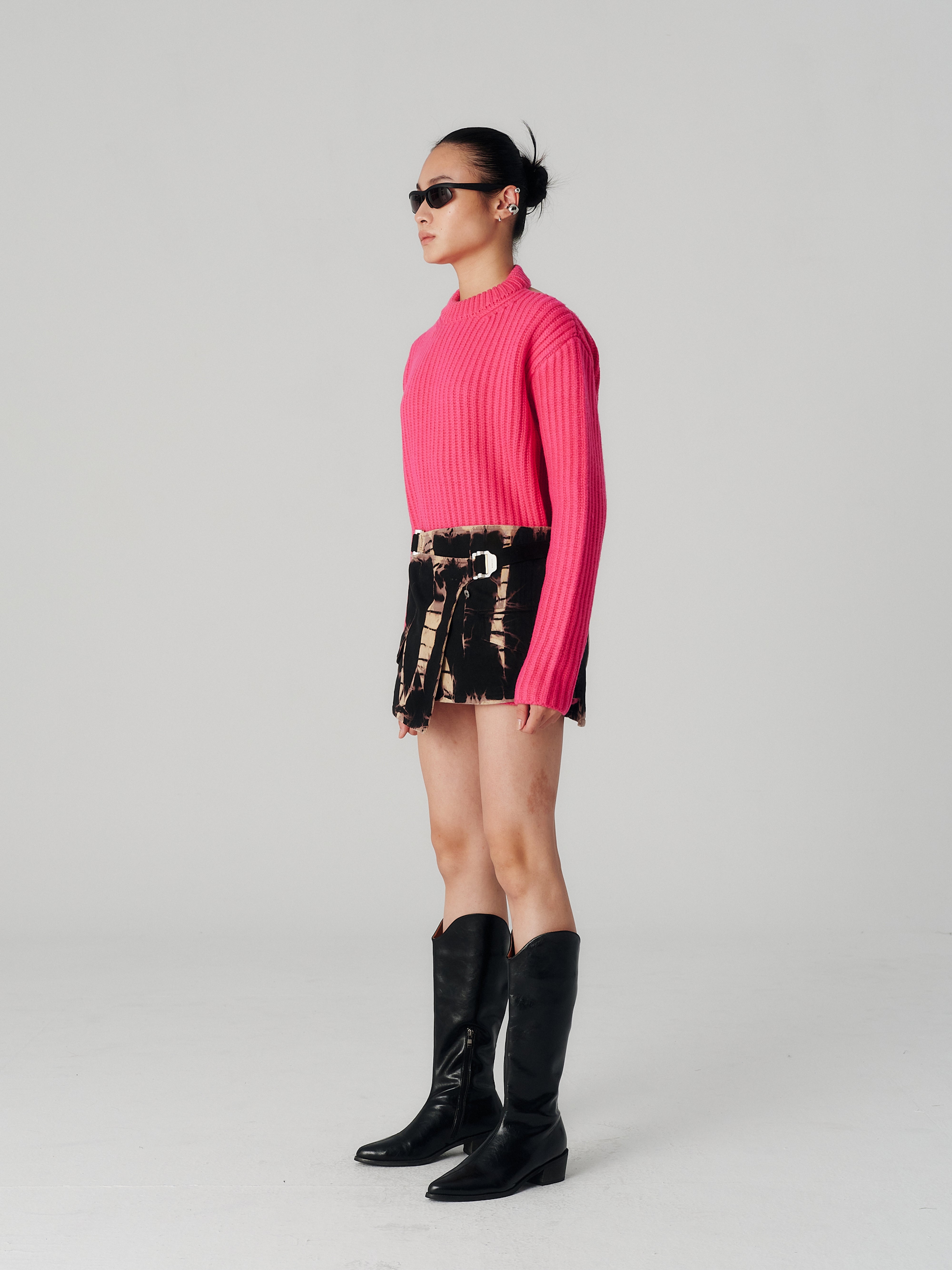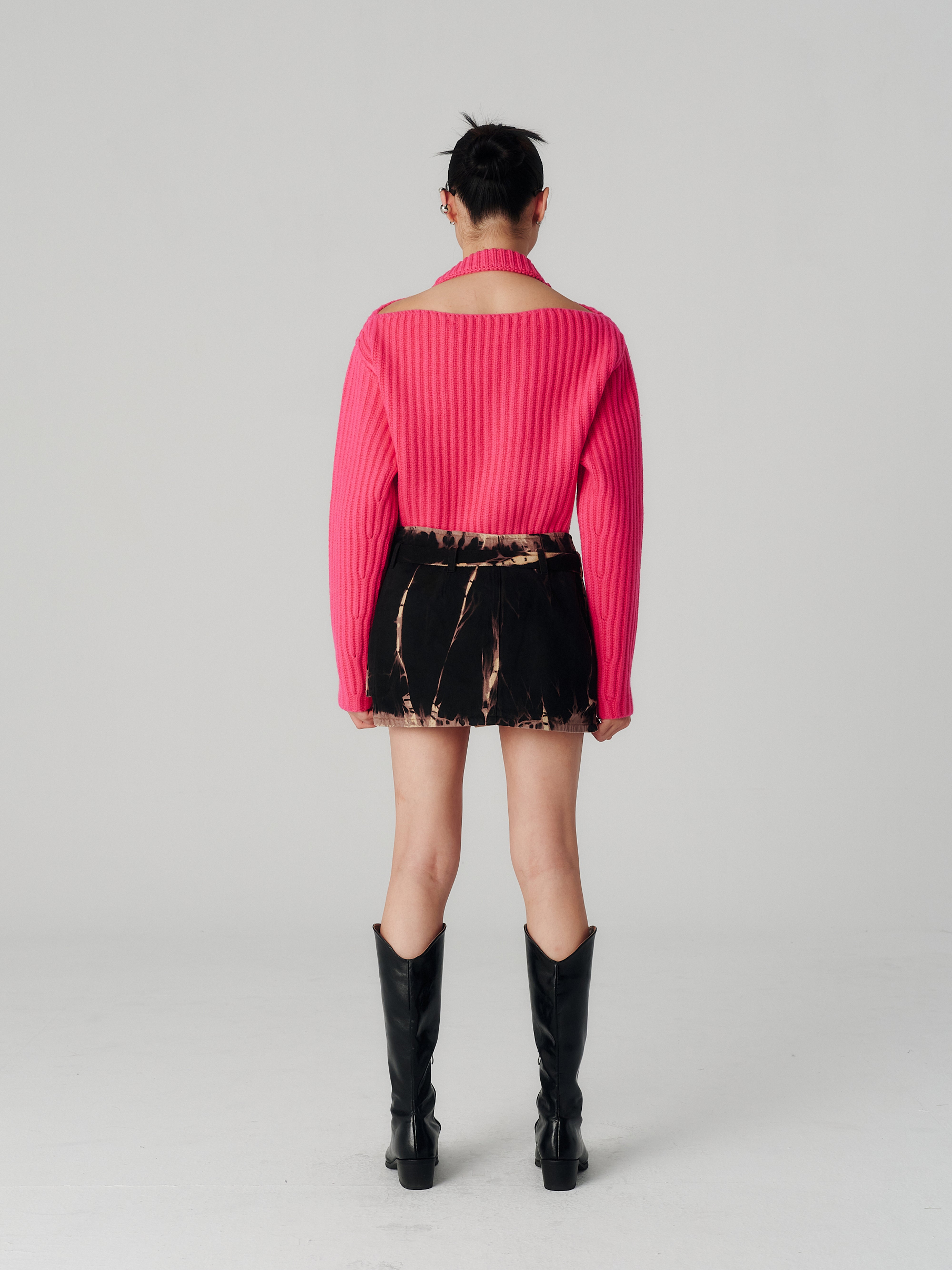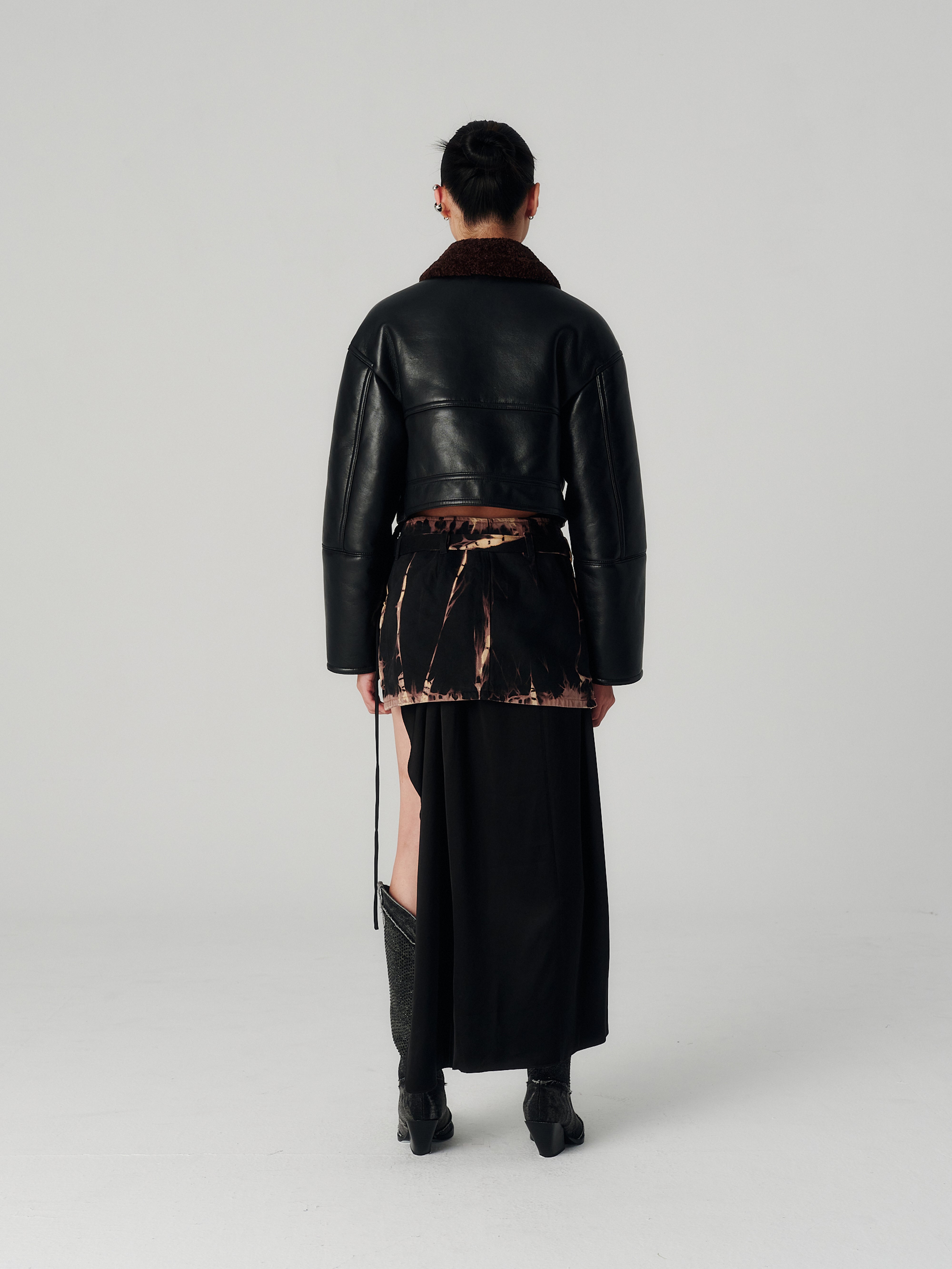 Mid-rise mini skirt cut in a soft, midweight denim. Garment is reverse tie-dyed with bleach for unique variations in each piece. Skirt wraps with cotton grosgrain tape and custom slider buckle hardware. Cut to sit at the hip with a stacked hem.