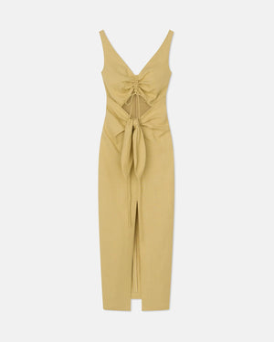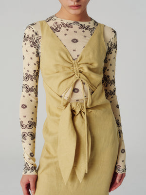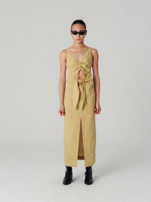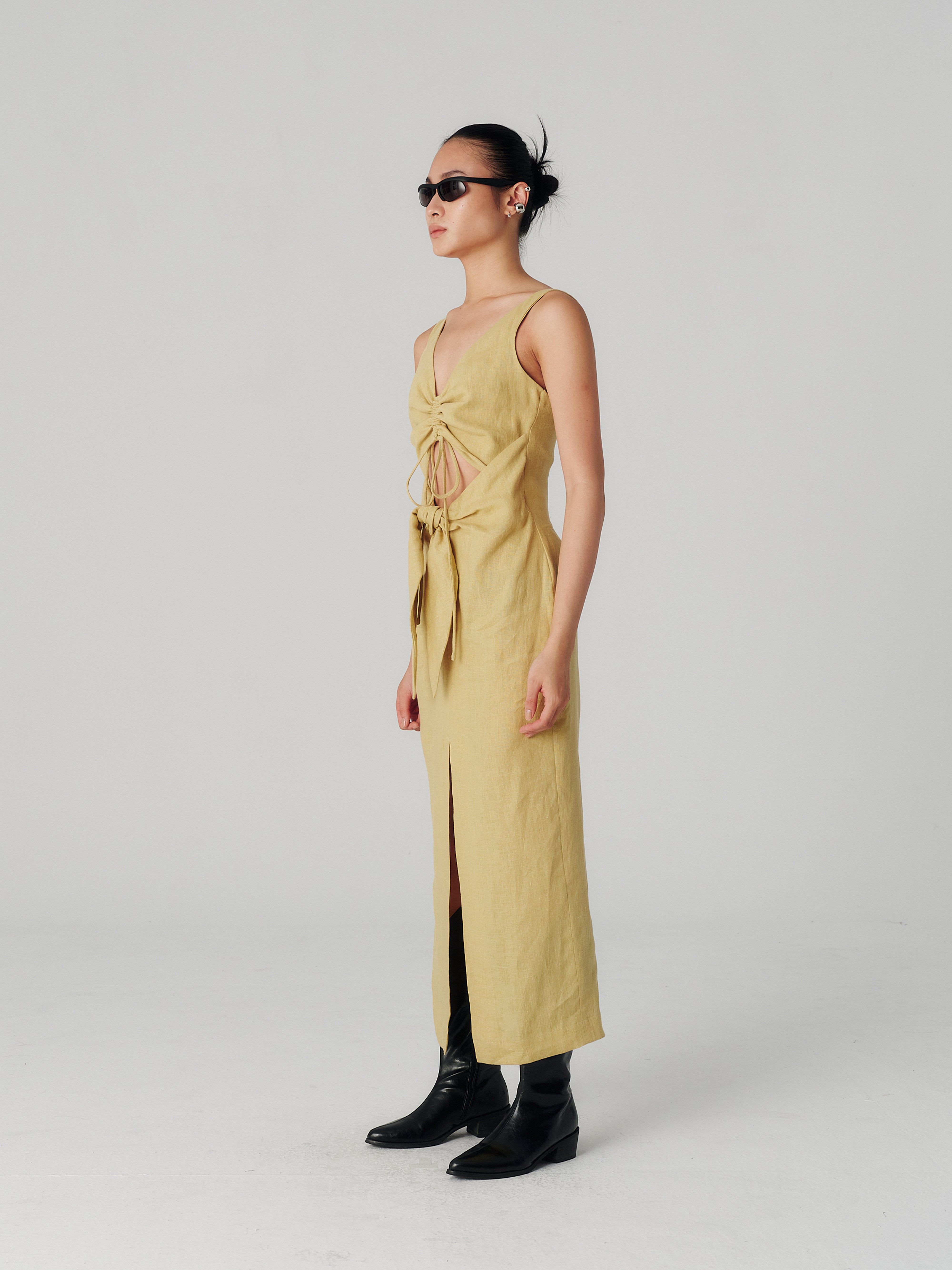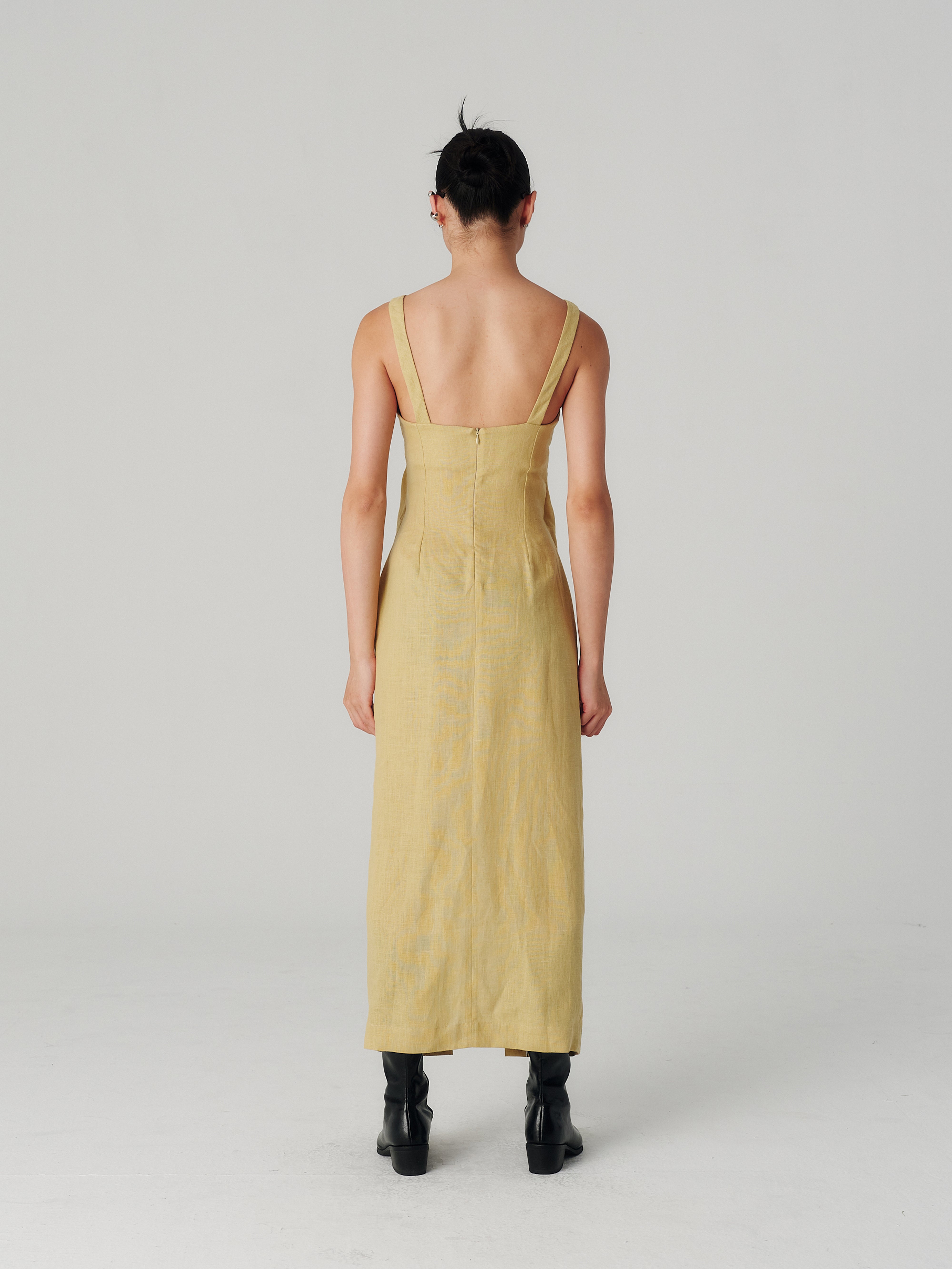 Kubra is a linen blend jumpsuit with a rustic oat hue. It has a modern silhouette with pleat detailing and stylish lapels, creating an air of relaxed sophistication.