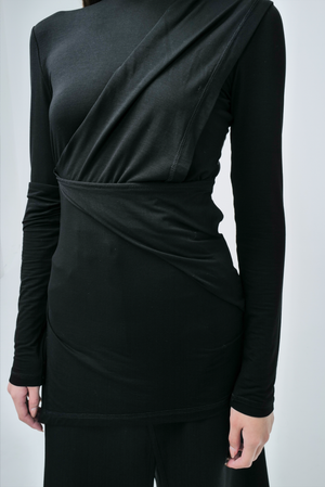 - Features a layered design with draped panels that wrap around the body, creating a sense of movement and allowing for flashes of exposed skin