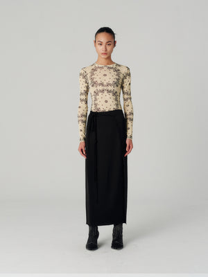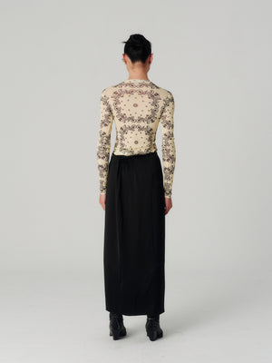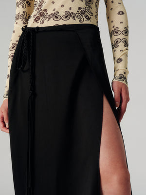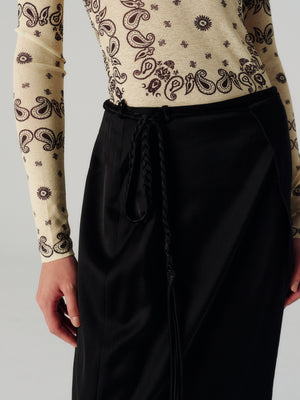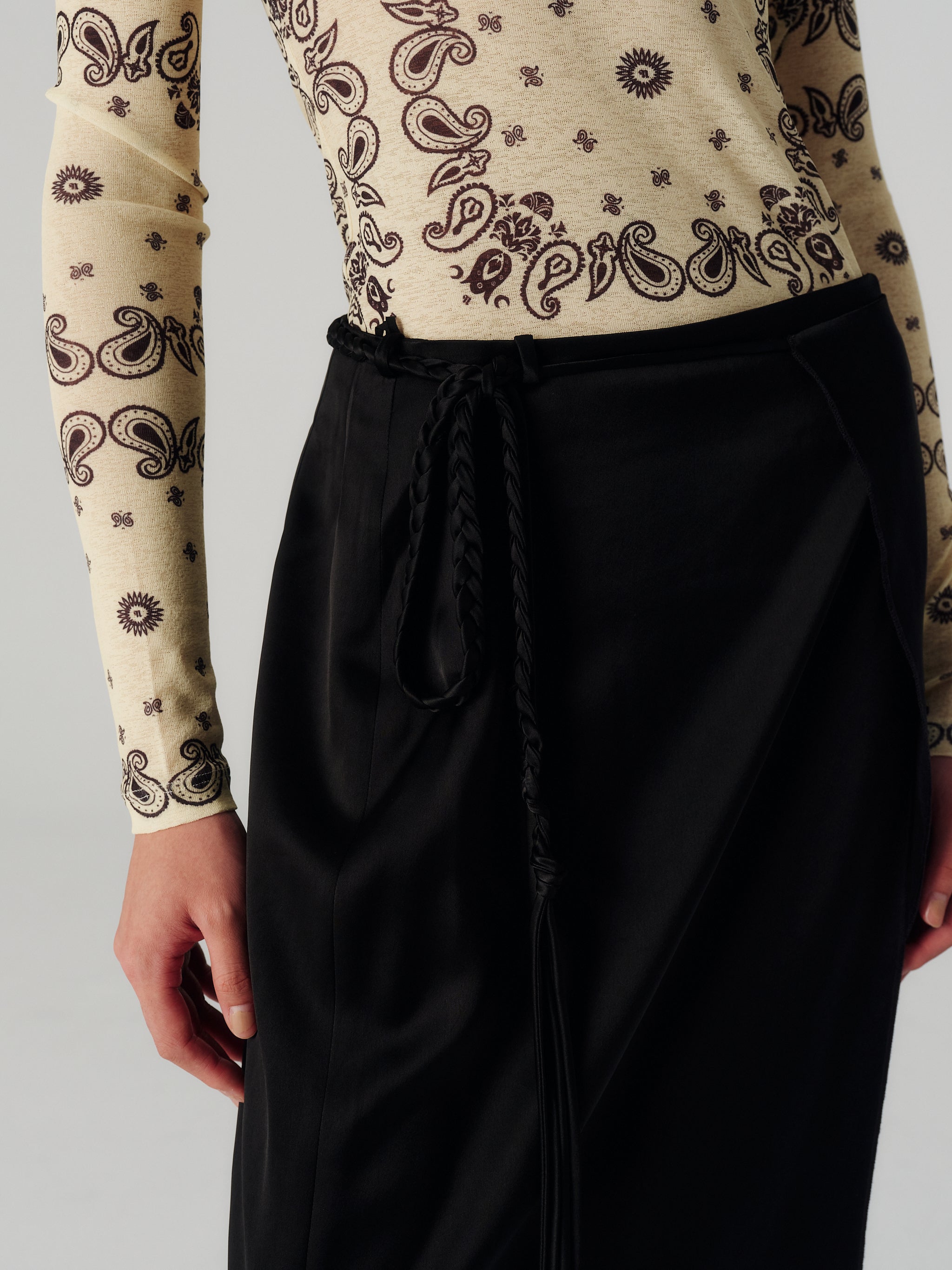 Made from glossy black slip satin, it's had a cross-over front that’s secured with ties at the side.