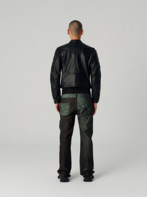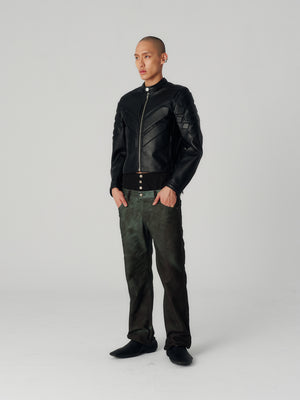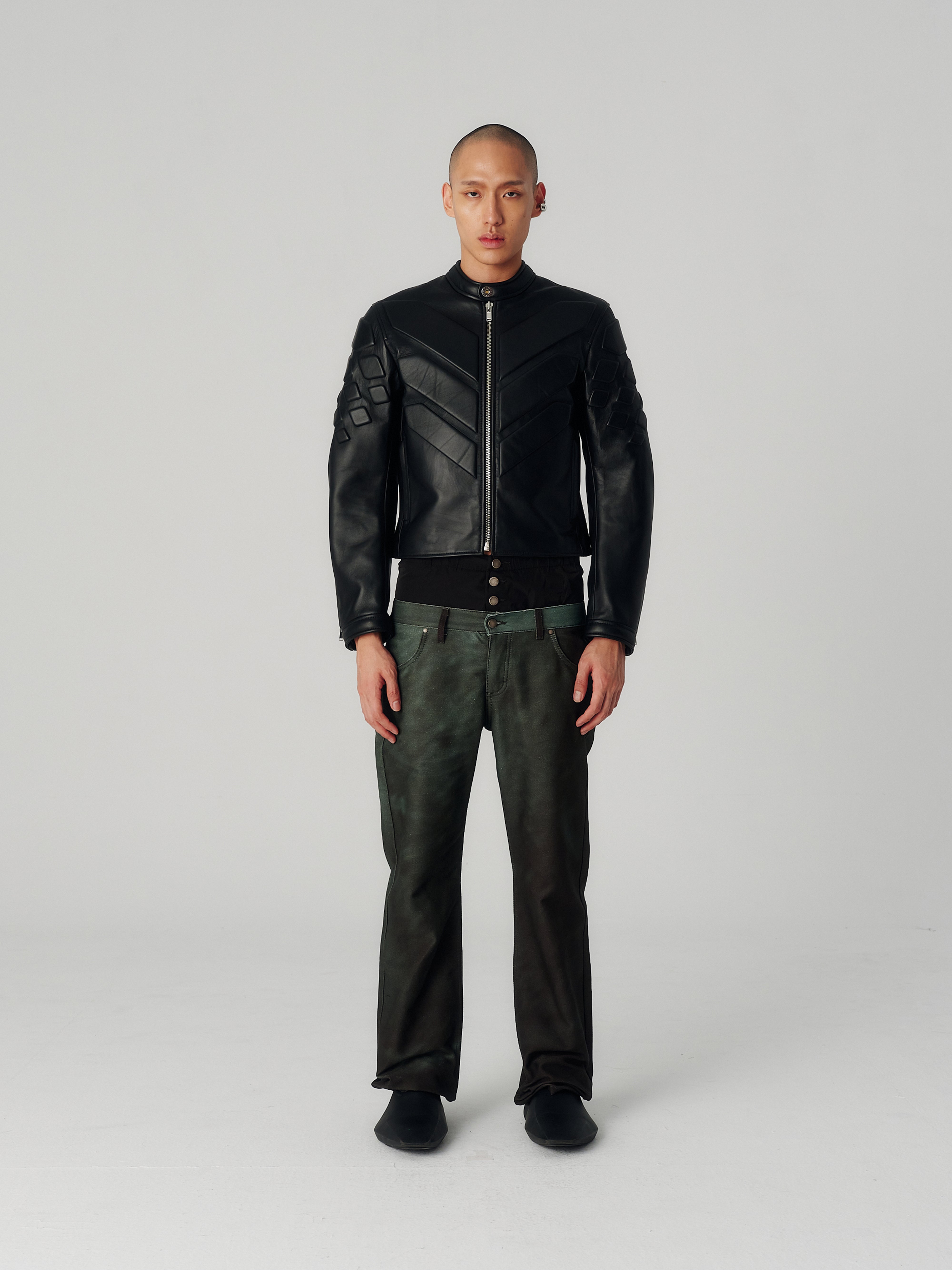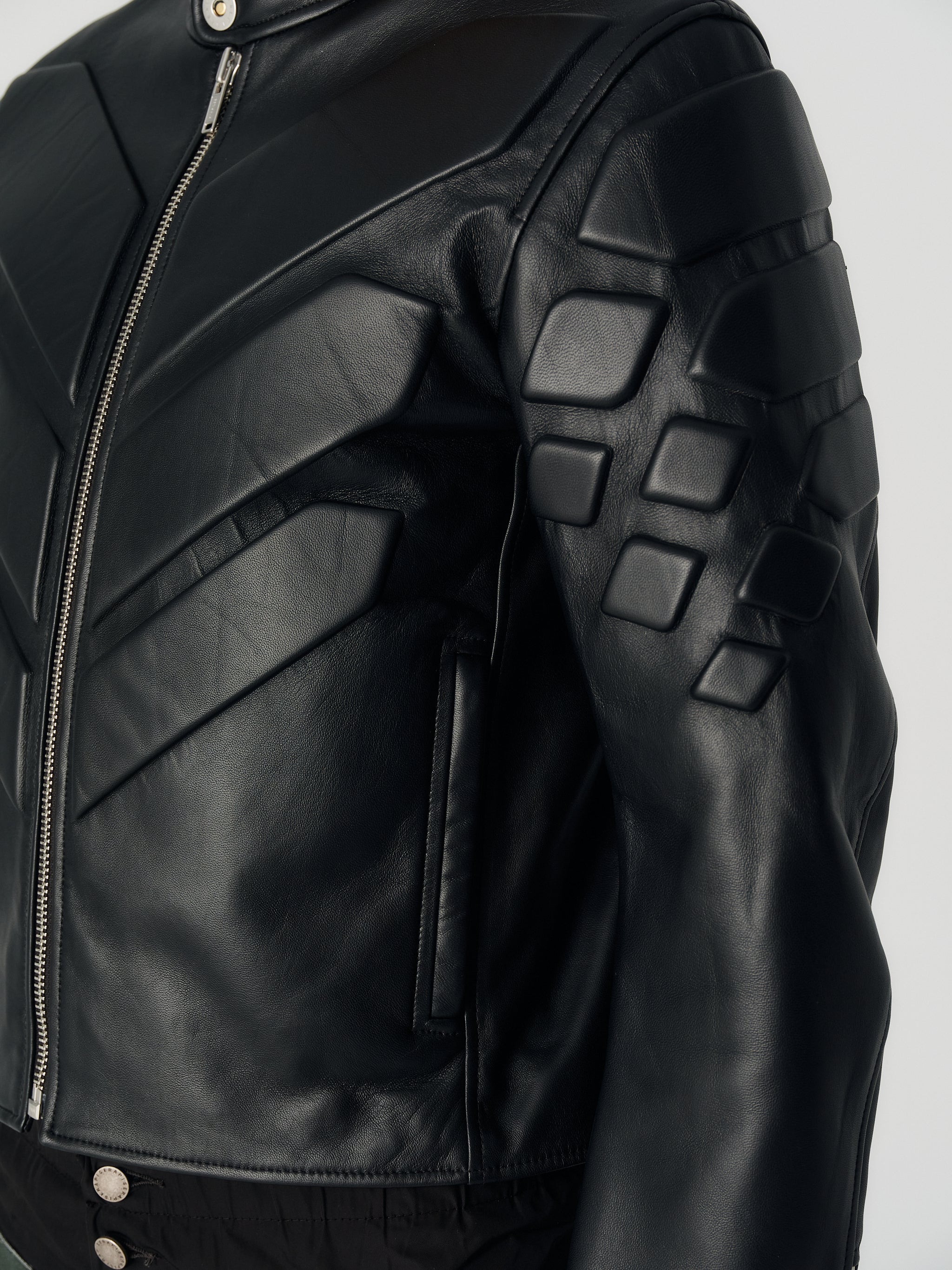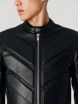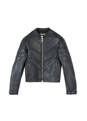Leather racer jacket crafted from a premium smooth nappa lambskin. Featuring moto technique of heat pressed foam patches for moulded diamond panels. Snap tab collar and cuffs with signature two-tone eyelet snaps. Cut for a regular, slightly cropped fit and fully lined.