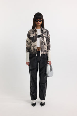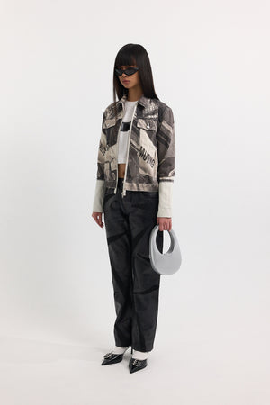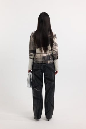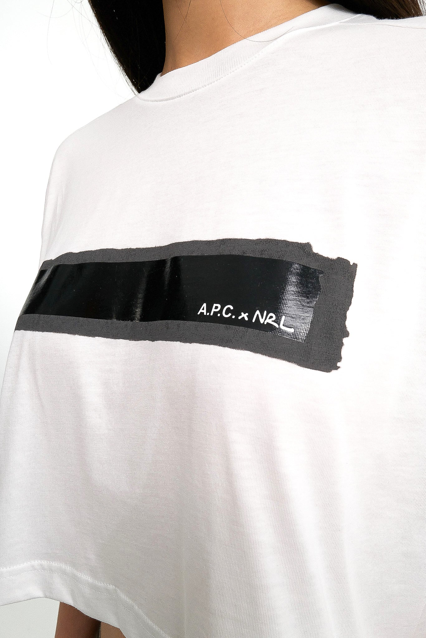 - Shiny and matt print with 'A.P.C. x NRL' on a black background, as if written in marker on gaffer tape