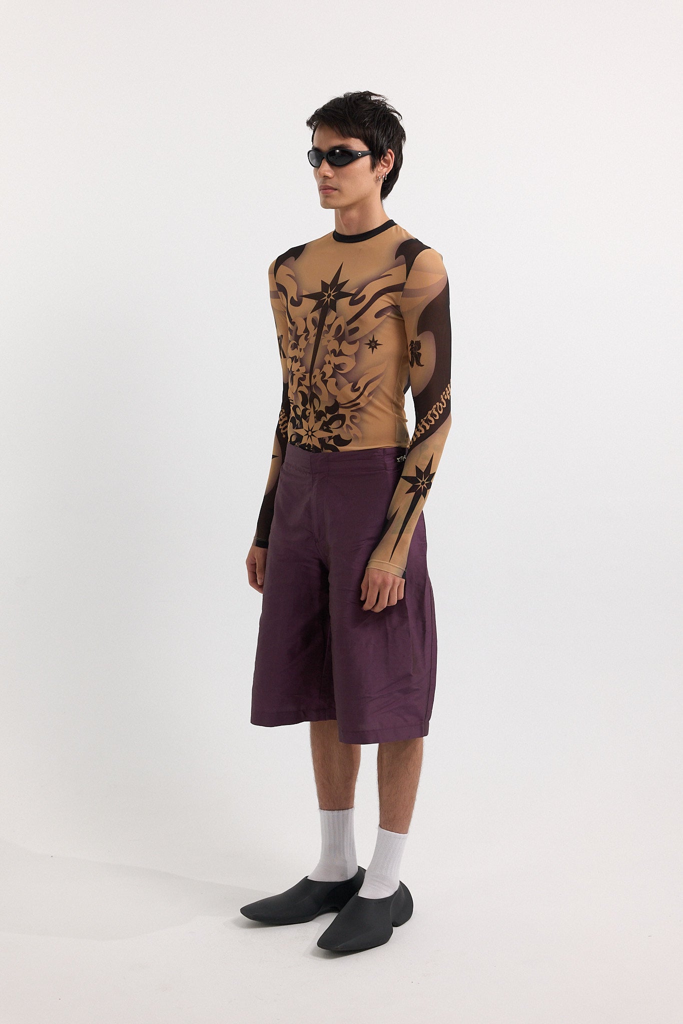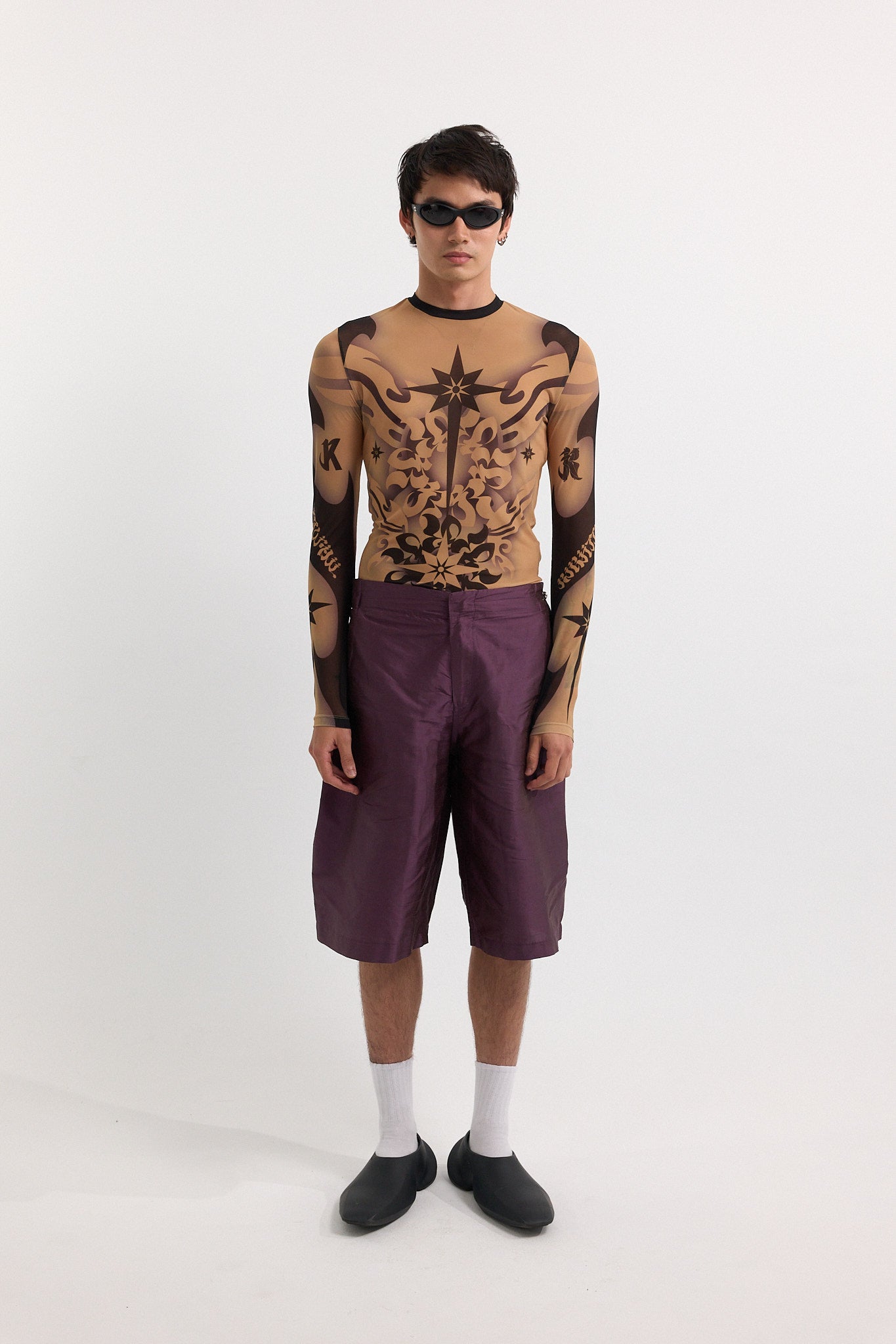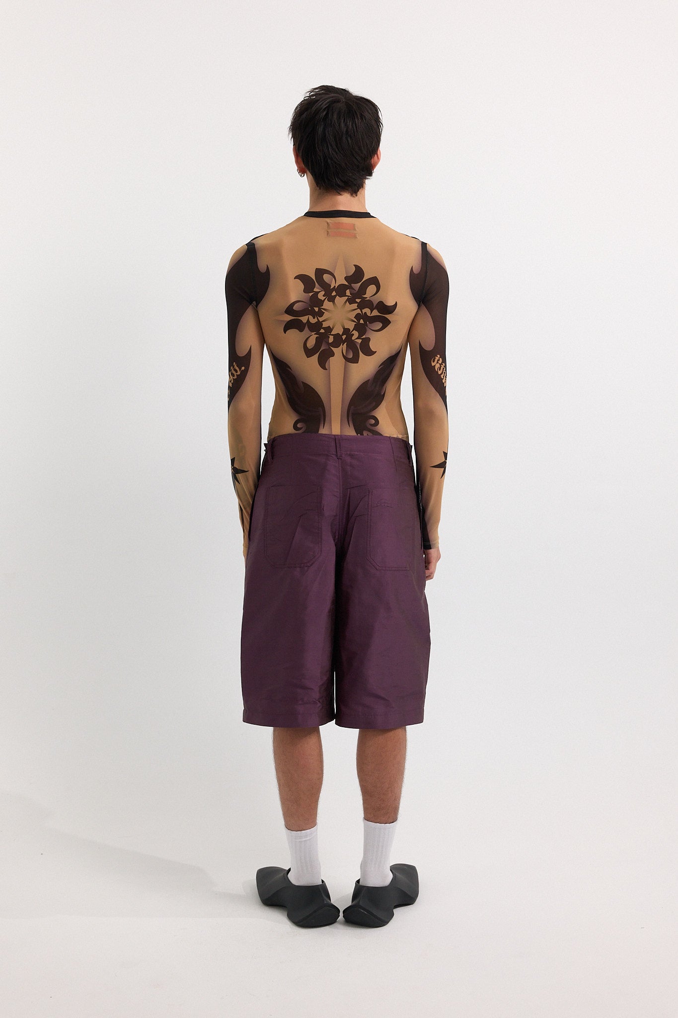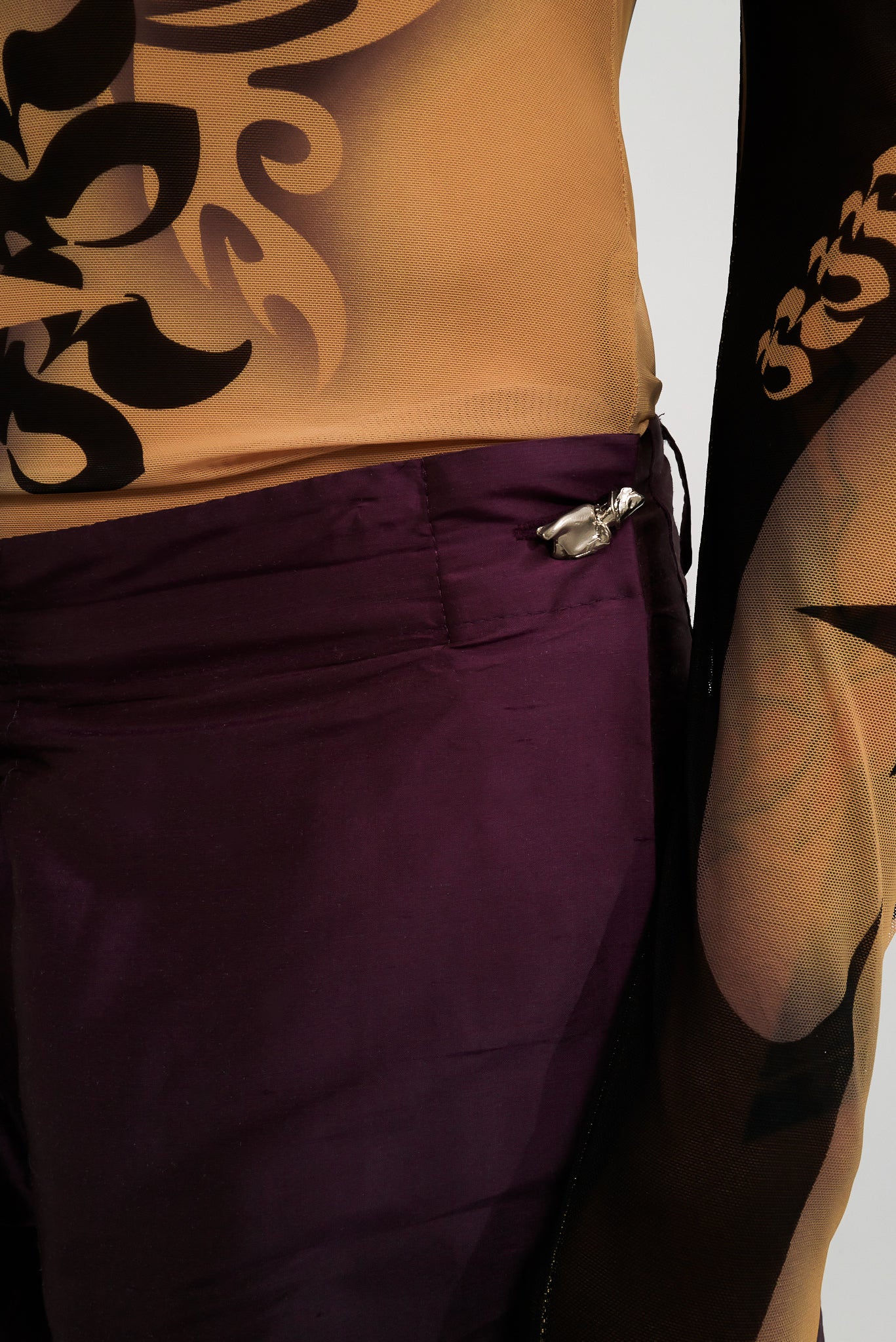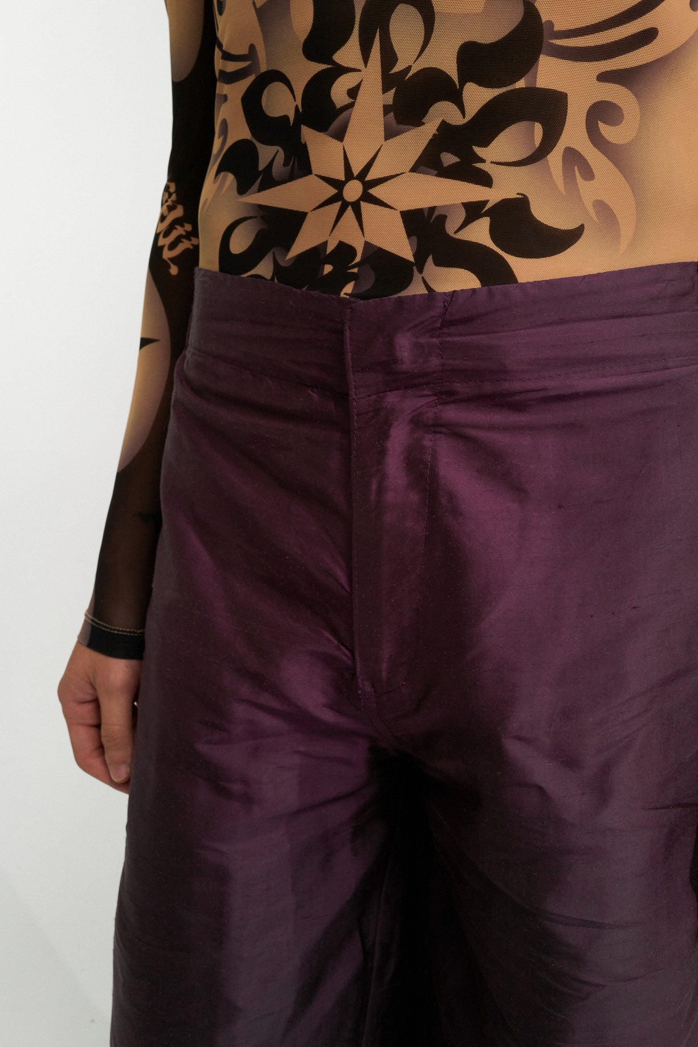 - Purple basket shorts made of raw silk taffeta featuring belt loops and a jewel ring on the side