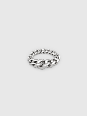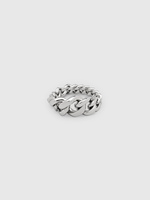 - A medium sized band ring combining a classic curb chain with custom casted links in a graded assembly