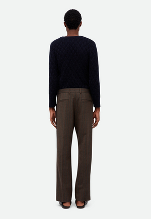 - Rich mouliné tailoring wool with a viscose lining and navy velvet trouser braid