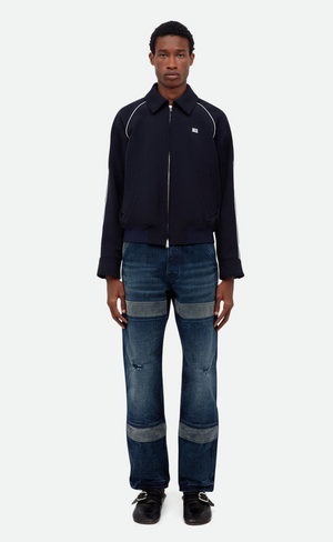 - Navy Harrington silhouette crafted in a technical twill fabric with contrast piping and logo embroidery