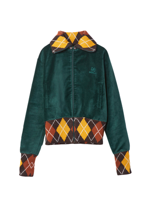 This velvet tracksuit features a diamond-weave knit hem and sophisticated green and yellow tones, providing a retro vibe and stylish style.