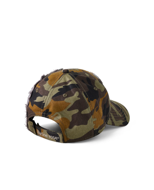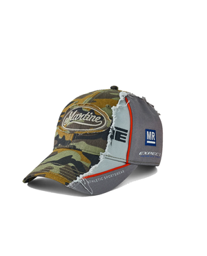 - Two caps for the price of one. distressed baseball cap with contrasting camo and grey panels. with embroidered seasonal logo patch at the front, seasonal art work embroidery at the side, piping and adjustable back strap