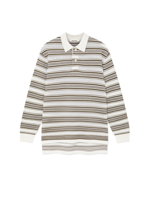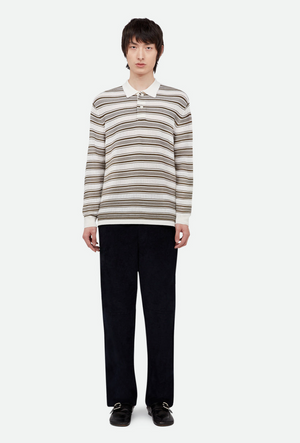 - Breathable wool and viscose knit with contrast stitch stripes and color-block collar, hem, and cuff details