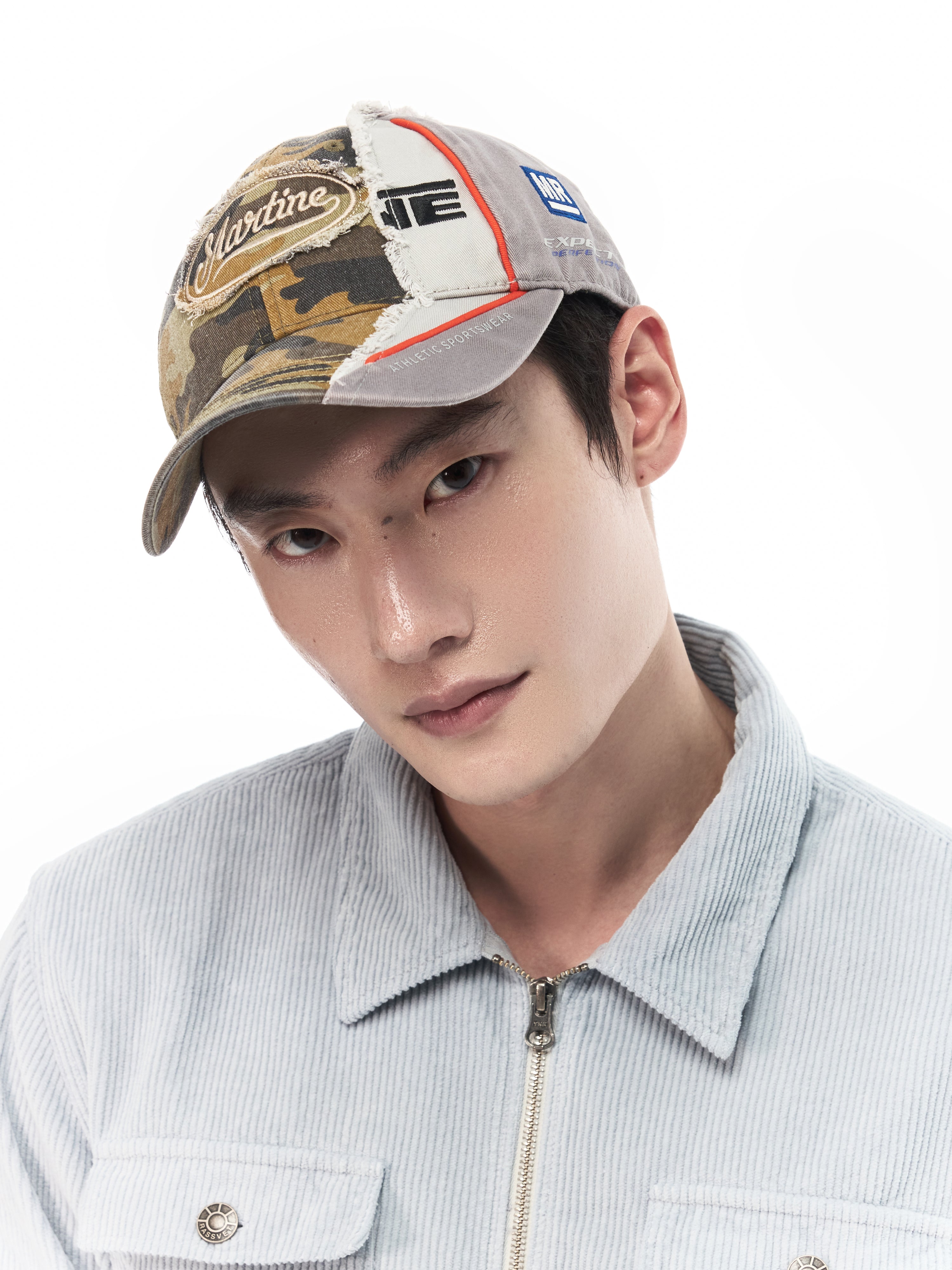 - Two caps for the price of one. distressed baseball cap with contrasting camo and grey panels. with embroidered seasonal logo patch at the front, seasonal art work embroidery at the side, piping and adjustable back strap